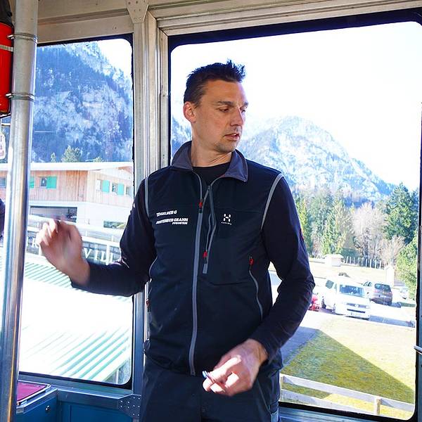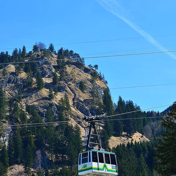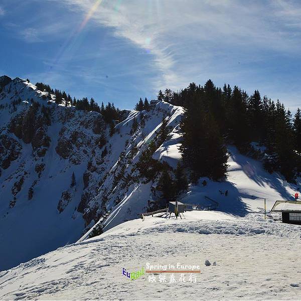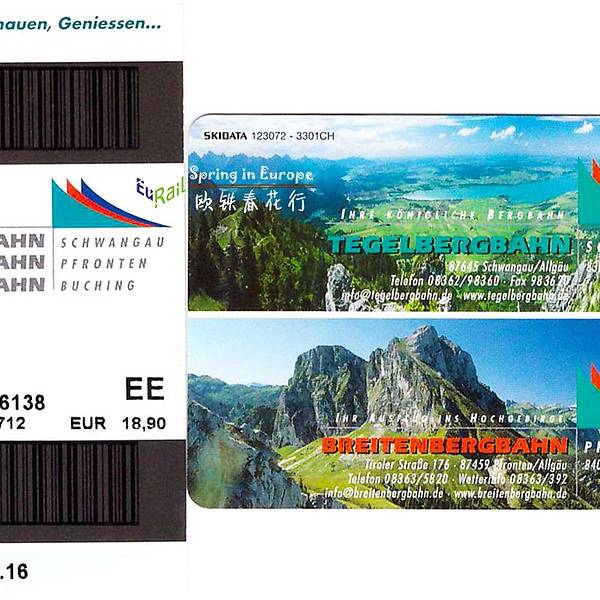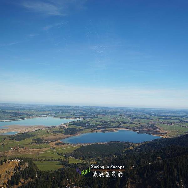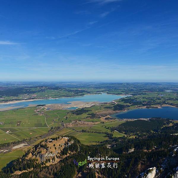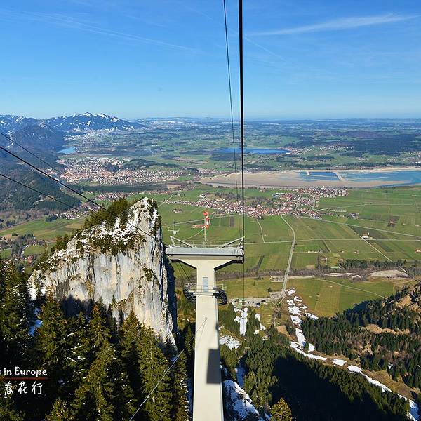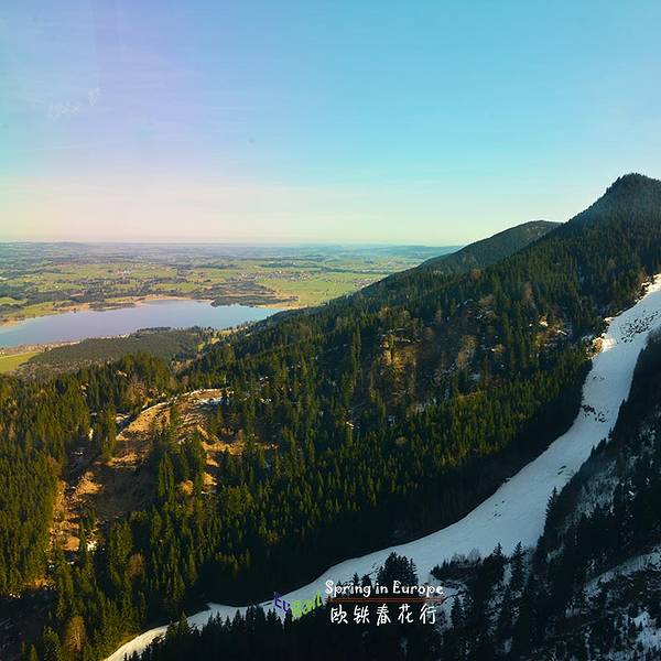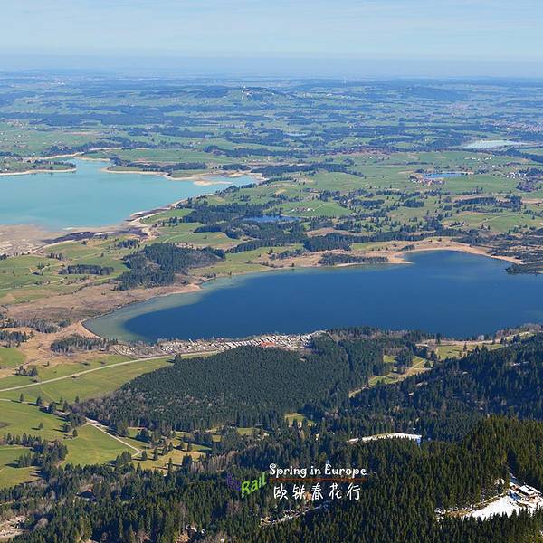 山上许多徒步行线路是全家郊游和徒步登山爱好者的理想选择,冬季这里是滑雪爱好者的天堂,速降滑道非常有名泰格尔山位于福森东面5公里的施万高镇,是一座风光秀丽迷人的山峰。可以乘坐缆车到达山顶,在山顶可以欣赏阿尔卑斯山雄壮巍峨的全景,鸟瞰美丽的福森和施万高湖光山色。站在山顶即站在巴伐利亚最大的自然保护区“...泰格尔山位于福森东面5公里的施万高镇,是一座风光秀丽迷人的山峰。可以乘坐缆车到达山顶,在山顶可以欣赏阿尔卑斯山雄壮巍峨的全景,鸟瞰美丽的福森和施万高湖光山色。站在山顶即站在巴伐利亚最大的自然保护区“阿默尔山脉”(Ammergebirge)的门前。山上许多徒步行线路是全家郊游和徒步登山爱好者的理想选择,冬季这里是滑雪爱好者的天堂,速降滑道非常有名。4月9日,抵达福森的第二天一早,我们就搭乘公交大巴前往泰格尔山。依旧是在福森公交车站的二号站台,其实就是搭乘去新天鹅堡的大巴,到了那里不下车继续前行,不久就可以抵达。我们要搭乘缆车前往山巅,缆车下丛林间白色的雪道,就是这里的速降滑雪赛道。泰格尔山的缆车车厢,四周是大片的玻璃窗,方便游客观景。我们用“福森卡”购买了缆车票,价格是18.90欧每人,貌似正价是19.50欧吧,意思意思的优惠而已。缆车票发售后一年内有效,刷卡进入乘车区。虽然看起来这个缆车费用很贵,但是山巅和途中的景色绝对让你值回票价。早间的缆车乘客很少,所以到任何旅游点错峰出行很重要。车厢里游客少,才能够有机会向四周观览美丽的风景,也才有机会拍摄到各个角度的照片。初春,应该是这里的旅行淡季吧?我们差不多是清早第一批的客人。服务人员是个大帅哥,既是售票员,又是缆车司机。泰格尔山的海拔在1730米,从缆车起点站看终点站高高在上。缆车缓缓上升,不一会,远方的新天鹅堡和阿尔卑斯湖已经进入眼帘。缆车的另一边,则是广阔的平原和宁静的湖泊。上山搭乘缆车的时候,相机装的是24-70的镜头,因此只能遥遥拍到新天鹅堡在早晨阳光里的英姿。这个角度,可以拍摄到新天鹅堡和高天鹅堡在一起的画面,可以看到两者的地理位置关系和海拔差异。缆车进一步升高,两个漂亮的城堡已经在我们的脚下,阿尔卑斯湖也显露出自己曼妙的身姿,缆车线路上有一个高耸的山岬,会在接下来的行程里阻挡住观赏天鹅堡的视线,这是能够看到新天鹅堡的最后一瞥了。这条白色的雪道,就是泰格尔山的滑雪速降赛道,起点就在索道的山顶站边上。冬季时候滑雪爱好者就这样搭乘缆车上山,然后滑雪速降到山脚,再次上山,乐此不疲,兴致盎然。缆车行进到这个位置,司机会停下缆车让乘客观景。左侧的山岬挡住了观赏新天鹅堡的视野,不过其他方向的视线非常开阔,风景秀丽无比。缆车的北方,有两个大湖,浅色的叫福尔根湖(Forggensee),是一个人工湖,其实是一个大水库,冬天的时候排水到干涸,春天开始蓄积阿尔卑斯山上融雪的涧水而成为夏季游客嬉水的好地方,湖畔有环湖步道,可以骑自行车环湖。