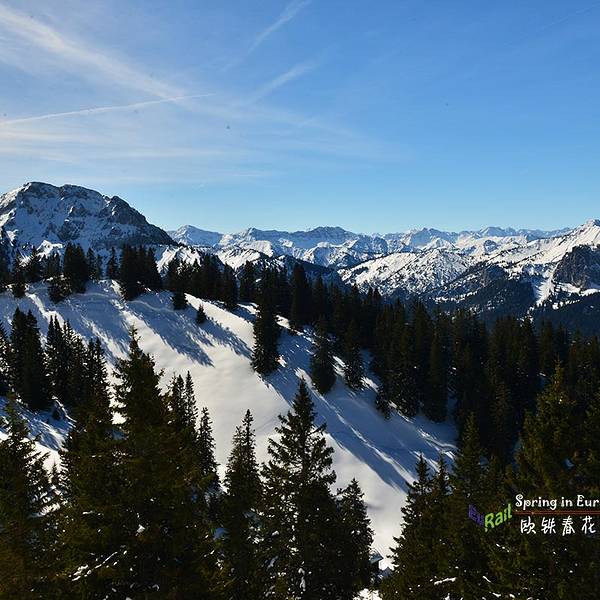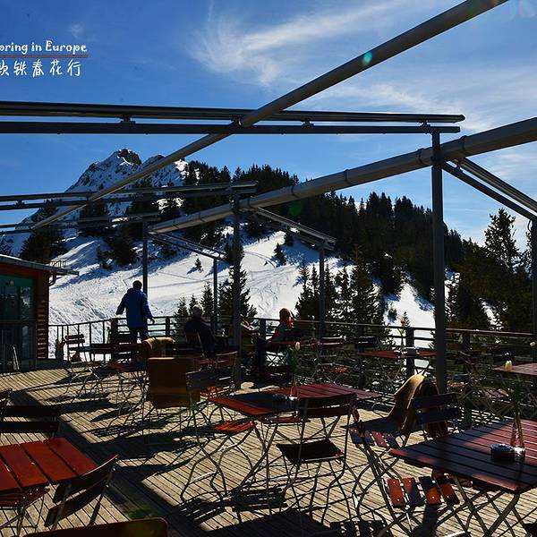 泰格尔山位于福森东面5公里的施万高镇,是一座风光秀丽迷人的山峰。可以乘坐缆车到达山顶,在山顶可以欣赏阿尔卑斯山雄壮巍峨的全景,鸟瞰美丽的福森和施万高湖光山色。站在山顶即站在巴伐利亚最大的自然保护区“阿默尔山脉”(Ammergebirge)的门前。山上许多徒步行线路是全家郊游和徒步登山爱好者的理想选择,冬季这里是滑雪爱好者的天堂,速降滑道非常有名。4月9日,抵达福森的第二天一早,我们就搭乘公交大巴前往泰格尔山。依旧是在福森公交车站的二号站台,其实就是搭乘去新天鹅堡的大巴,到了那里不下车继续前行,不久就可以抵达。我们要搭乘缆车前往山巅,缆车下丛林间白色的雪道,就是这里的速降滑雪赛道。泰格尔山的缆车车厢,四周是大片的玻璃窗,方便游客观景。我们用“福森卡”购买了缆车票,价格是18.90欧每人,貌似正价是19.50欧吧,意思意思的优惠而已。缆车票发售后一年内有效,刷卡进入乘车区。虽然看起来这个缆车费用很贵,但是山巅和途中的景色绝对让你值回票价。早间的缆车乘客很少,所以到任何旅游点错峰出行很重要。车厢里游客少,才能够有机会向四周观览美丽的风景,也才有机会拍摄到各个角度的照片。初春,应该是这里的旅行淡季吧?我们差不多是清早第一批的客人。服务人员是个大帅哥,既是售票员,又是缆车司机。泰格尔山的海拔在1730米,从缆车起点站看终点站高高在上。缆车缓缓上升,不一会,远方的新天鹅堡和阿尔卑斯湖已经进入眼帘。缆车的另一边,则是广阔的平原和宁静的湖泊。上山搭乘缆车的时候,相机装的是24-70的镜头,因此只能遥遥拍到新天鹅堡在早晨阳光里的英姿。这个角度,可以拍摄到新天鹅堡和高天鹅堡在一起的画面,可以看到两者的地理位置关系和海拔差异。缆车进一步升高,两个漂亮的城堡已经在我们的脚下,阿尔卑斯湖也显露出自己曼妙的身姿,缆车线路上有一个高耸的山岬,会在接下来的行程里阻挡住观赏天鹅堡的视线,这是能够看到新天鹅堡的最后一瞥了。这条白色的雪道,就是泰格尔山的滑雪速降赛道,起点就在索道的山顶站边上。冬季时候滑雪爱好者就这样搭乘缆车上山,然后滑雪速降到山脚,再次上山,乐此不疲,兴致盎然。缆车行进到这个位置,司机会停下缆车让乘客观景。左侧的山岬挡住了观赏新天鹅堡的视野,不过其他方向的视线非常开阔,风景秀丽无比。缆车的北方,有两个大湖,浅色的叫福尔根湖(Forggensee),是一个人工湖,其实是一个大水库,冬天的时候排水到干涸,春天开始蓄积阿尔卑斯山上融雪的涧水而成为夏季游客嬉水的好地方,湖畔有环湖步道,可以骑自行车环湖。 深色的这个湖叫班瓦尔德湖(Babwaldsee),因为湖水较深而显示出湛蓝的颜色。缆车在短暂的停留后继续驶向山巅的终点,随着高度的上升,远处的施万高镇和福森镇渐次在眼前展开。抵达山顶,此时俯瞰北面的两个湖面,色彩各异,环肥燕瘦。泰格尔山的山顶,依旧满是积雪。太阳映照在头上,气温并不很低,体感不冷,但是脚下踩在雪地里的感觉还是很实在的,让人一下子又仿佛回到了两个月前在芬兰和瑞典踏雪追逐北极光的日子。山顶的峰峦,都被厚厚的积雪覆盖,平整得没有任何脚印。泰格尔山有很多条徒步的线路,不过此时,估计只有滑雪板才可以走吧?我们没有准备,普通的运动鞋在这里几乎寸步难行,而其他专程来滑雪的都是上山就套上了滑雪板开始出发……面对雪峰,我们只能艳羡那些滑雪者了,不过山上的空气那是极好的,所以就安心看景,呼吸纯净新鲜的氧气,感受这里白皑皑的宁静和安详吧。山脚下,满是红褐色屋顶的德式建筑组成的福森小镇。远处的那个湖泊就是霍普芬湖(Hopfensee),是我们下午要去游览的目的地。小心翼翼地在雪地里挪动自己的步伐,找个好的角度观景和拍摄照片。山巅的建筑就是泰格尔山的缆车站和山顶餐厅所在。站在这里,就可以遥望到阿尔卑斯山脉的众多山峦雪峰,连绵不断,迤逦蜿蜒。在春日还能够在艳阳下赏到如此雪景,也算不虚此行。这是我在山顶攀爬到的最高点了,缆车站也变得小小的,如同在雪地里的道具。总体而言,初春时的游客很少,才能保有这些未曾被践踏出脚印来的厚厚积雪。夏天,从泰格尔山是有步道可以直接徒步前往新天鹅堡的,大概总长5公里多的山路,三四个小时步行就能穿越而至。山巅,有一家餐厅,极好的景观位置。在这里休憩下,晒晒太阳,喝个咖啡,来份美食,真正是人生的一大享受。当你老了,当你闲了,可以带上自己的爱人,在山巅雪峰前,和煦的暖阳下,享用一顿精美的餐食,在这里留下最美好的记忆。这就是在山巅餐厅的座位上拍摄到的阿尔卑斯山脉风光,仁者乐山智者乐水,山水之乐,吾心足矣。餐厅门口的装饰和菜单、价码牌,这里的菜品价格并不比镇上的高很多,但是拥有完全不一样的景观,推荐有时间来这里的朋友安排一次就餐,会有很棒的旅行体验。身处美景,自然想留下自己的倩影。不过在这里拍照真的非常需要注意安全,因为积雪白天在融化,晚上又会结冰,因此很是湿滑,而自然保护区本身山边没有任何围栏等设施,一步过去就是万丈深堑。所以,切记要与边坡保持一定的安全距离。下山前,根据计划,将相机的镜头换成了80-400,以便拍摄新天鹅堡的倩影。先把远山雪峰拉过来入境。瑞士和德国的雪峰都是美极了的。
