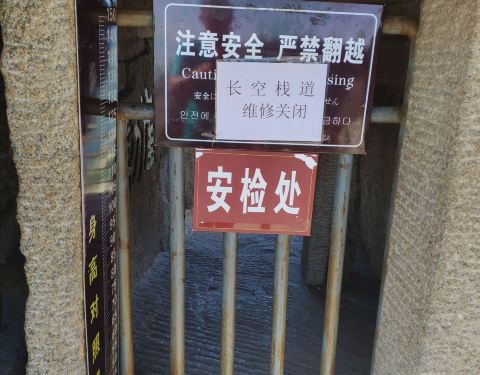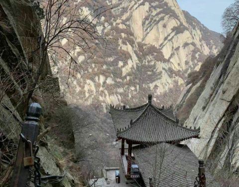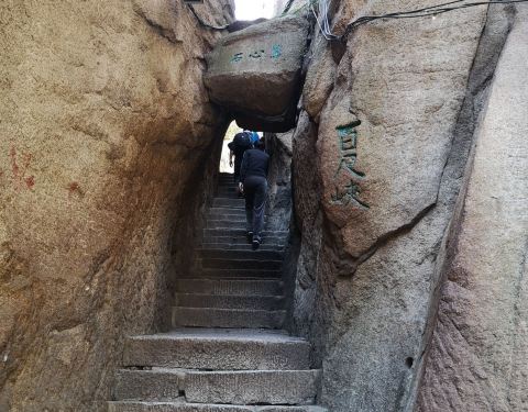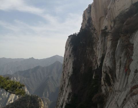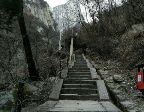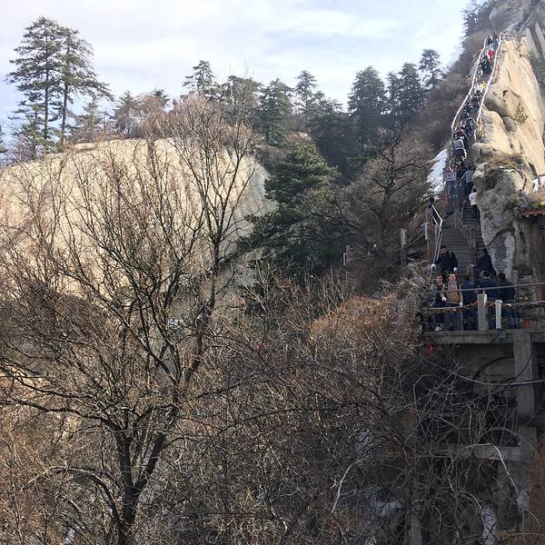 华山没有黄山的上上下下的台阶,也不像泰山那样一条比较平坦开阔的路,华山虽然海拔很高,但路并不是很长(iPhone步数),也从侧面反映出华山之险。可能因为时间的关系,华山的绿化不是很好,道路两边没有成片绿荫,有的只是萧瑟的枝条,也就是说:在宽1米不到的台阶两旁,你是能看到悬崖峭壁的,无尽的深渊也造就了一幅壮观的景象。也许你会害怕2333,但除了极个别的地方,其他的路还是挺好走的,在千尺㠉和百尺峡的前面,有一条较为平缓的岔路,可以从那边绕行~