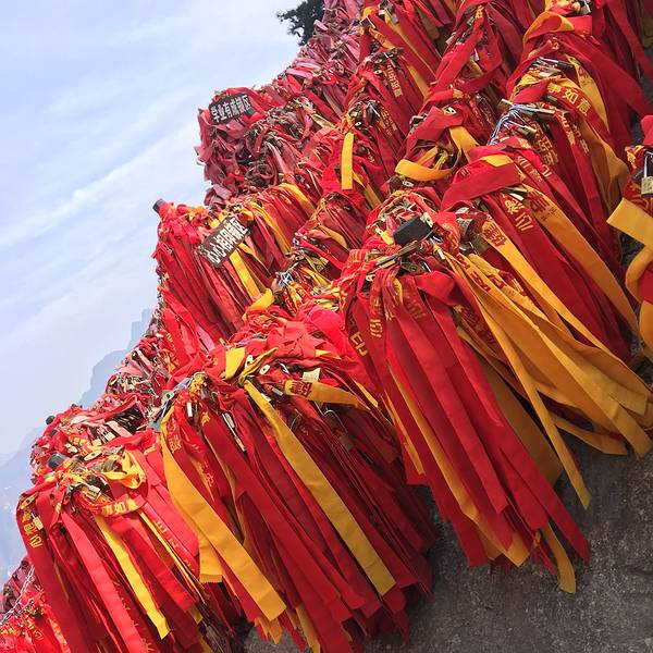 过了这两个后后面的路就比较好走了,大概花了3个小时左右,我们来到了北峰顶(中峰和东峰没有海拔的石碑。。),海拔石碑旁有金庸华山论剑的碑,拍照的人很多,其实后面的路上还有很多、、从白云峰到金锁关是一道漫长的路,我们走走停停,原来山上过夜看日出日落的计划也变成了当日坐缆车下山,路上有卖锁的,5元一把是最低价,可以刻名字日期啥的挂在金锁关那里,我挂了两把,有缘人可以去找找看2333。