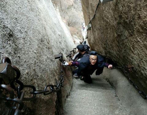 在去华山之前,如果问我哪里最难走,我会说是黄山前山的一线天,但跟华山的险比起来,那都不是事,侧身站在千尺㠉、百尺峡的台阶上,你的眼前就是台阶,虽然没有90°,但也有80°左右的斜度,路很窄,只容一人通过(两人侧身走也可以勉强过去),所以上下有分流,有时前面的朋友走错路的话就比较尴尬,而且要双手拉着铁链或者四肢爬行(心大的话可以不这样)。站在台阶上偶尔往后一撇,都很佩服自己,那种心灵的震撼,用言语和照片难以形容。