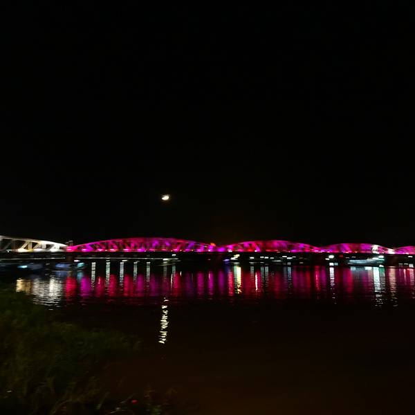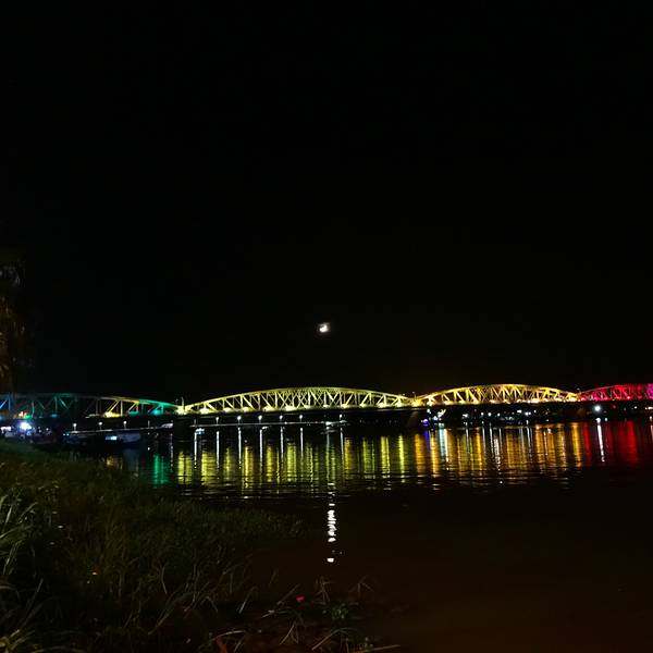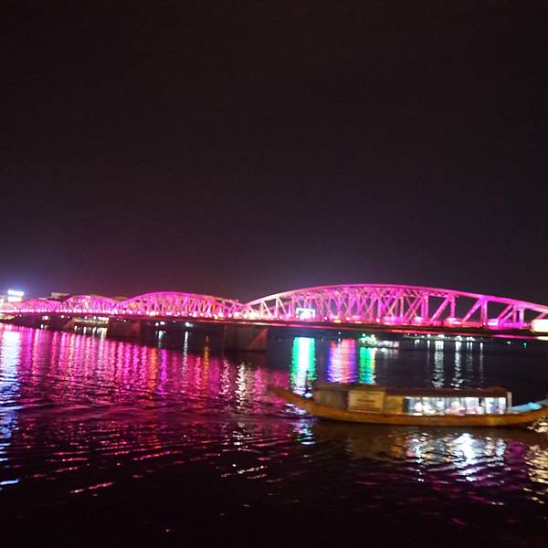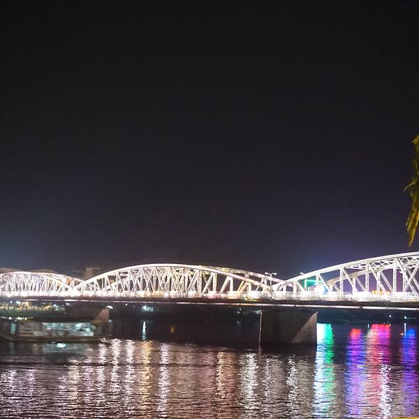 这是是越南顺化著名铁桥-钱场桥,晚上的灯光装饰下会比白天好看许多。通过钱场桥跨河而过,是去顺化皇城的必经之路,不...顺化作为曾经的古都,在越南的地位有点像我们的西安。虽然很有历史,但是景点却比较单一!