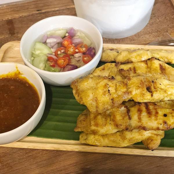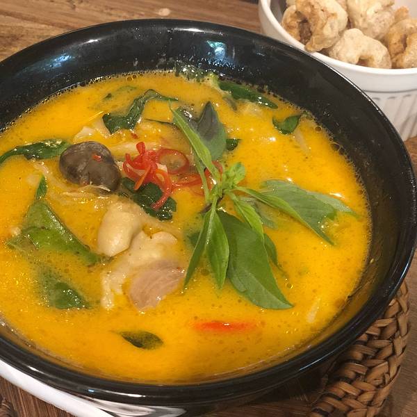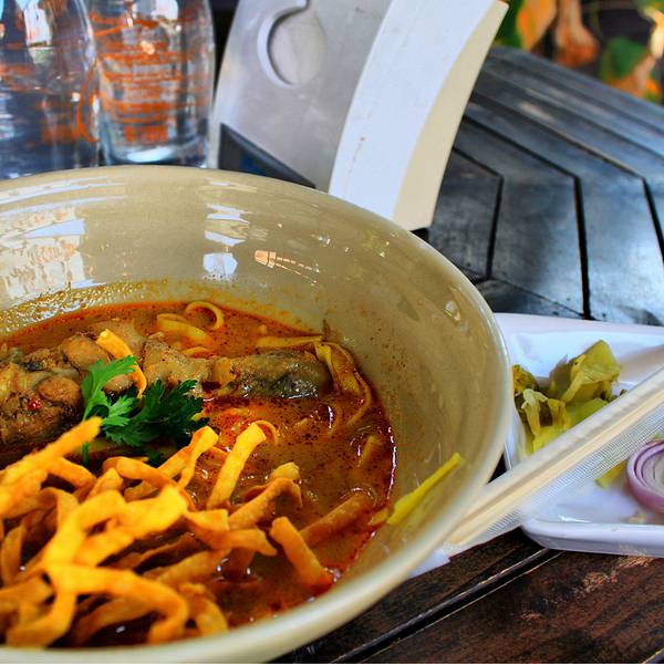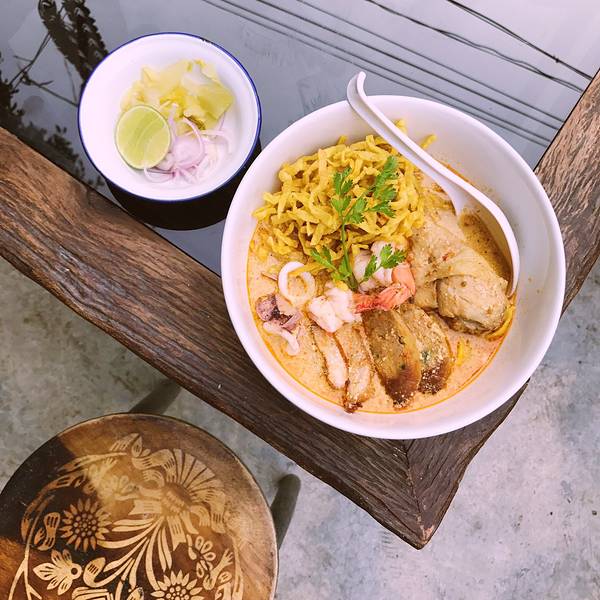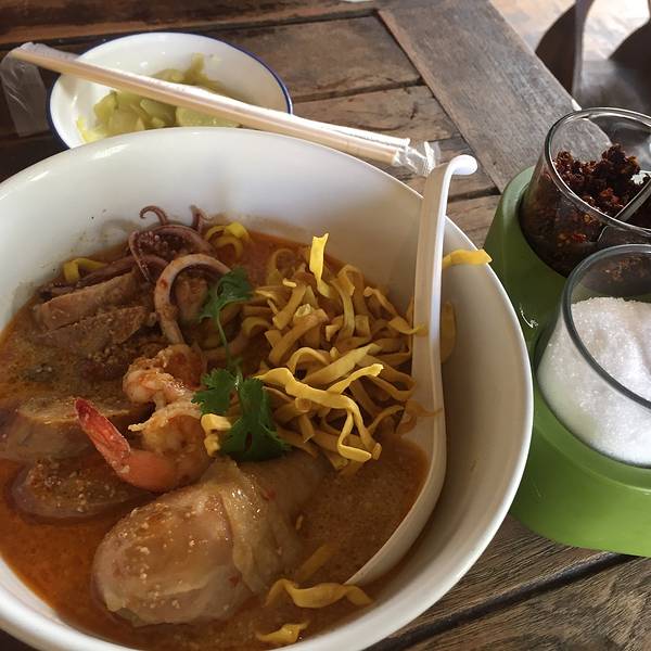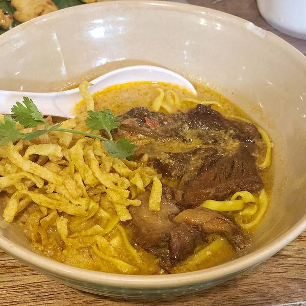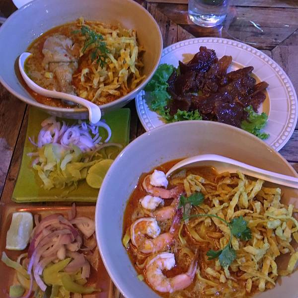 Kao Soi Nimman呆霖带我走回宁曼路找到Kao Soi Nimman餐厅,点了129฿豪华版咖喱面太好吃了,也有单点其中某种料搭配的咖喱面,一大碗我俩一起吃,里面有脆的软的两种面,料足汤美,恨不得第二天再来吃,下次去了也还是会想去吃,墙上挂满了明星来这儿的照片就可见实力拦了双条去周六夜市,一到入口 前面突然有人转过头来 是山兔,吓得我叫出了声,都要怀疑是不是跟踪了对方,有缘到这种地步