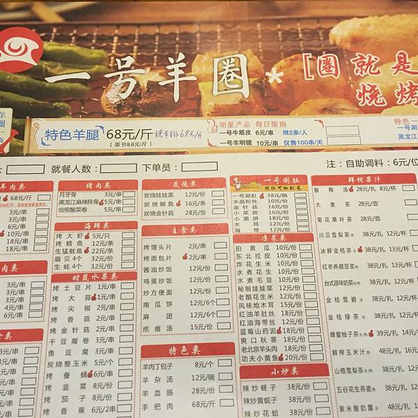 一号羊圈,口碑评分的一家人气烧烤店。位置在对外经贸大学南门斜对面,樱花东桥东侧,店内主打烤羊腿、烤羊肉以及涮肉,和一般地面有些油腻,光线昏暗的烤串店不同,这家店铺卫生清洁,座位之间的间隔也很大,看起来让人舒心,而消费又很亲民,人均不到100元吃的很好,经常有促销,我还是很推荐大家来了。 食物盐分控制的比较好,不像很多撸串店那样齁咸,可能重口的人不太喜欢,但是这样真的很健康。食物的分量也挺足的,服务态度好。但是缺点有2个:第一,店内WIFI密码需要扫二维码,实际也连不上;第二:冬天室内温暖明显较低,上来的串吃的稍微慢点,到后面口感都很腻了。 烤羊腿特价是68元一斤,因为和朋友2个人来吃,我们就没点。海鲜做的一般,蛤蜊个头小,而且有点沙的口感。烤串品质蛮不错的,推荐馒头片、月牙骨、羊肉、肉筋等,虾一串4元,分量也很足,烤的脆脆的。饮料要的酸梅汤,口感明显偏甜,28元一扎性价比一般。