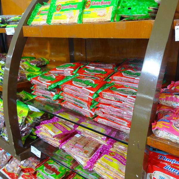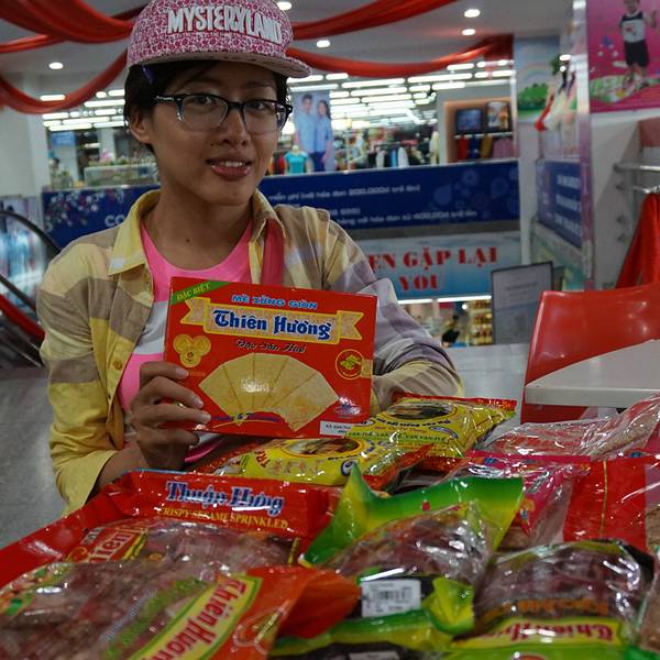 超市有两层,一楼卖食品和家庭用品,二楼是服装店和美食区。在这里买顺化饼比外面专卖店便宜一点。