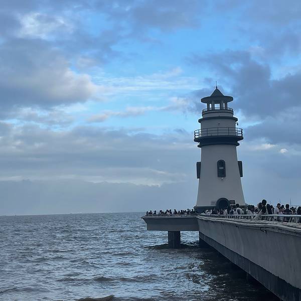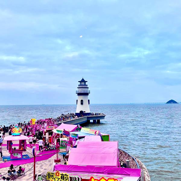 1️⃣ 灯塔全景:站在通往灯塔的栈桥上,以灯塔和蓝天为背景,拍下牵手或奔跑的亲子剪影。