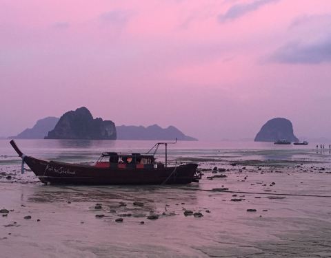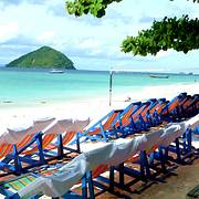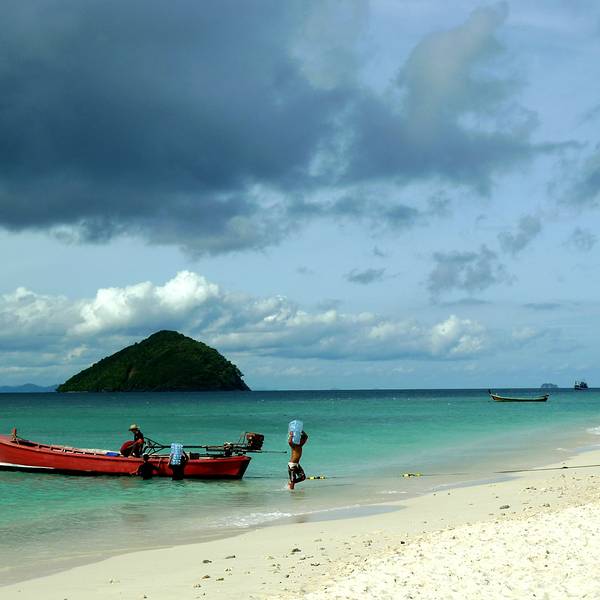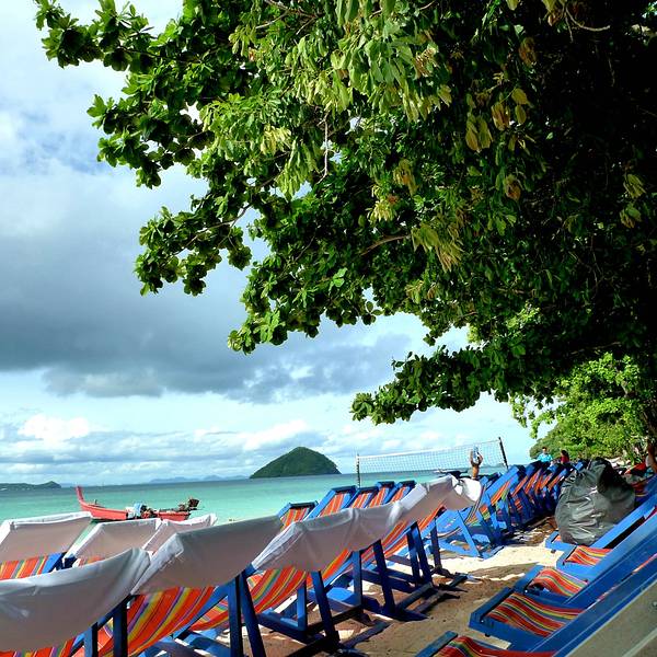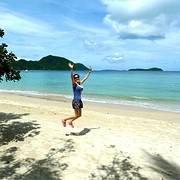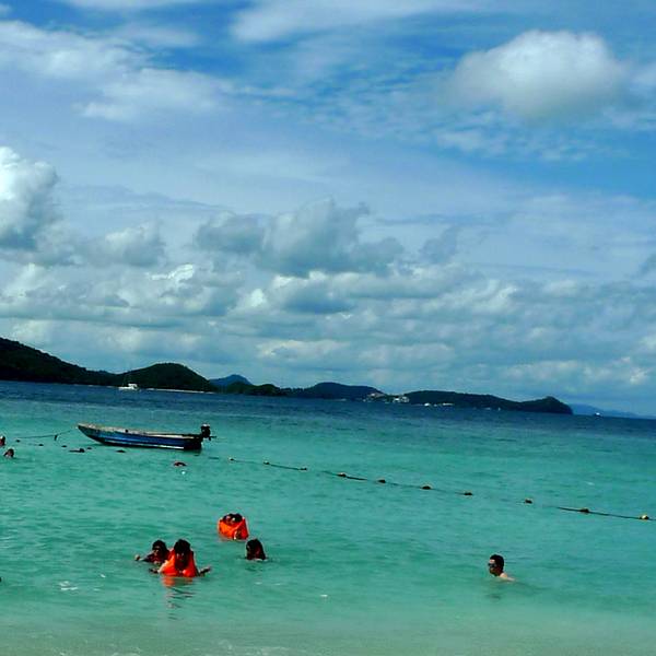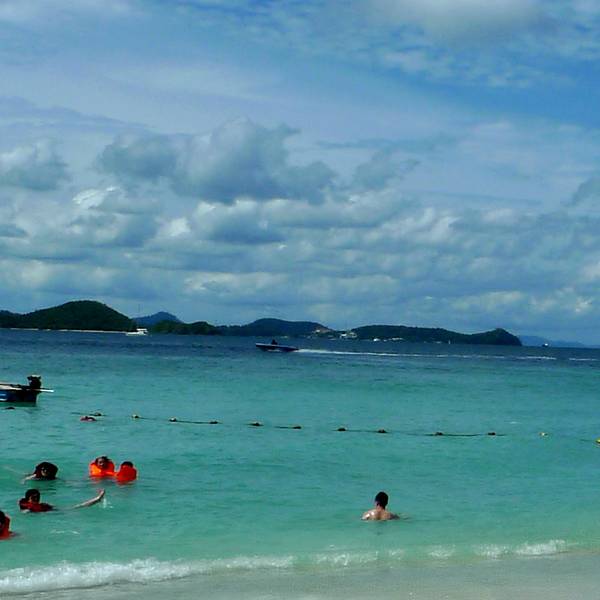 珍珠岛(Pearl island)距离普吉岛主岛有一段距离。根据当地船夫的说法,该岛的名字源于“佛祖在安达曼海洒下了一串珍珠”。我们从普吉岛东南部的chalong bay出发,乘坐快艇,行程约1个多小时到达(当时没有大船的航线,由于水域和距离原因,包长尾船又不现实)。当时十来个人拼的穿,人均约300元左右,全包,船上面有一些简单的设备,可以烤鸡翅,然后船家有一个大冰桶 ,里面都是冰块,雪藏这苏打水,果汁等东西,不过没有酒精类饮品,可能是贵,也有可能是信仰的缘故吧。一路上,波浪比较大,有个孕妇受不了,脑袋伸出去图,还有的帅哥到船前方去看风景,小看了太阳的威力(防晒油对安达曼海的紫外线完全不起作用),一身的腱子肉全给烤焦了,后面几天都动弹不得。好不容易登上了岛,发现虽然一路辛苦,但是还是很值得的。海滩很漂亮,小岛也比较安静,人不算多。水质和沙滩,比起普吉岛主岛的芭东海滩这一类海滩,好的不是一点半点。接着救生员出场了,有句话我至今记得:“你们不要以为自己很会游泳,我叔叔也很会游泳,我三岁的时候他去游到现在还没回来。。。”,很多人听完救生员的训导,穿上救生衣就扎到海里去了。海水很温和,阳光也没那么毒了,躺在海上飘着飘着,很惬意~岛上的资源比较匮乏,一些淡水和食物都靠船运输,游完泳以后,冲澡的水也是海水循环再造的,所以感觉洗不干净身上的盐分,海风吹干身子后,穿上衣服,有种怪怪的感觉。