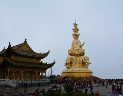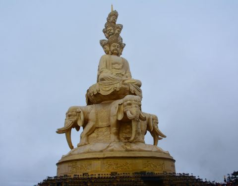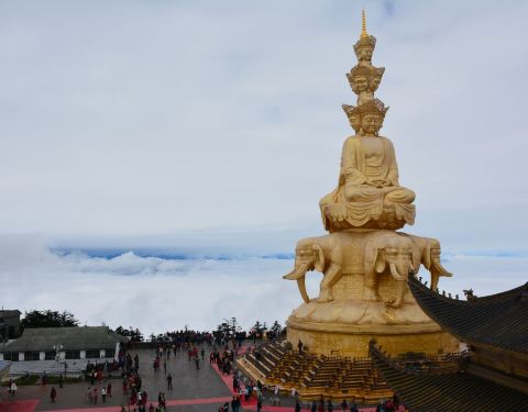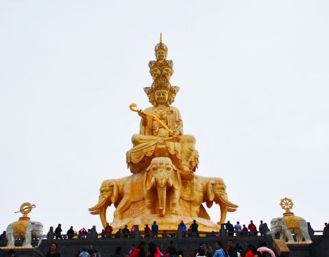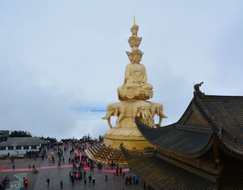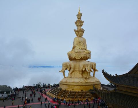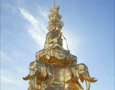 金顶中心处的十方普贤,是峨眉山的标志,也是世界上海拔较高的金佛。它是铜铸镏金工艺佛像造像,通高48米(代表佛祖的48个愿望)。在蓝天的衬托下,佛像散发出令人震撼的光芒。十方普贤菩萨是大乘佛教行愿的象征。“十方”意喻普贤的十大行愿,也是象征佛教中的东、南、西、北、东南、西南、东北、西北、上、下十个方位,意喻普贤无边的行愿能圆满十方三世诸佛和芸芸众生。普贤菩萨的十个头像分为三层,神态各异,代表了世人的十种心态。大象背上第一层为普贤菩萨的四头像和两面身;第二层为普贤菩萨四头像;高层为前后普贤菩萨头像。圣像下的台座内部,是一个的佛中殿,供奉阿弥陀佛铜像,四周绕汉白玉雕佛像。