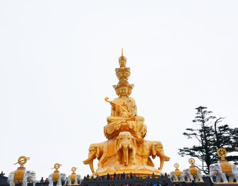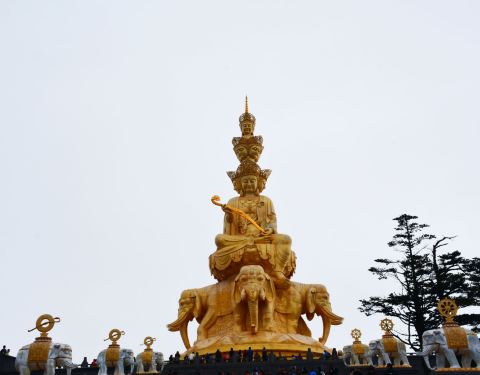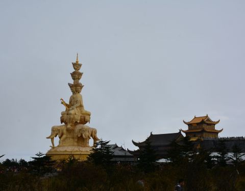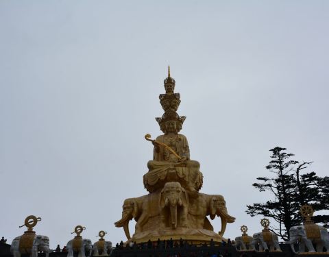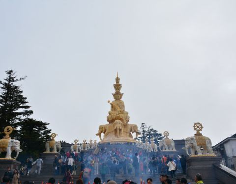这座高大的普贤菩萨金身像是峨眉山的标志性景观,位于海拔3099米的千佛顶之上,华藏寺正前方,造...这座高大的普贤菩萨金身像是峨眉山的标志性景观,位于海拔3099米的千佛顶之上,华藏寺正前方,造型精美、气势恢宏,彰显佛法无边,是游客们竞相拍照、留念的地方。
