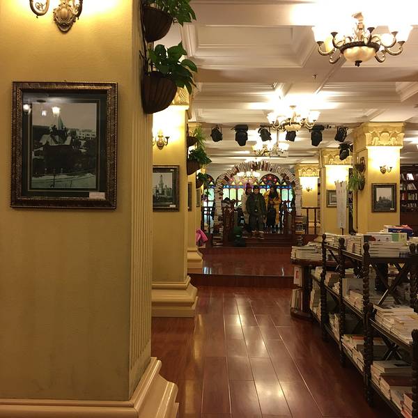 这家是去年还是前年开的,在果戈里大街上,靠近洁净街,对面是咿呀呀kfv,当时报纸微信微博铺天盖地的新闻,说是最美书店之类,特意前往,其实是有点失望的。 果戈里大街在若干年前叫奋斗路,果戈里大街是解放前的名字,俄风,后来改回了以前的名字,叫起来比较洋气,果戈里大街上还有很多老建筑跟欧式建筑的小细节。这家复刻的俄式建筑的很多特点,彩色窗户,大吊顶,美倒是不错的,只是缺少了一点点精气神。店里有读书分享会,分享会的举办地点是二楼大厅,其实一共两层,一楼只些简单的壁画跟旧照展,二楼大厅占据了一半的分享会,还是用麦克的那种。倒是读书心情陡降,真心有点吵,没办法认真看书,起码买书也要略读一下,也没了兴致。 书籍不多,每种一两本,倒是有些很特别的门类,其他书店不常见的书籍。 服务普通,有点国营范儿。 另外还经营咖啡饮品,就是可以看书喝咖啡的地方,只是有点吵。 公交8路,12路在儿童公园站下车比较近,果戈里大街是单行,建议坐公交车,很方便,也不堵车。门口一楼到二楼楼梯上的装饰,还有旧照片展览大厅的吊顶很华丽吊灯