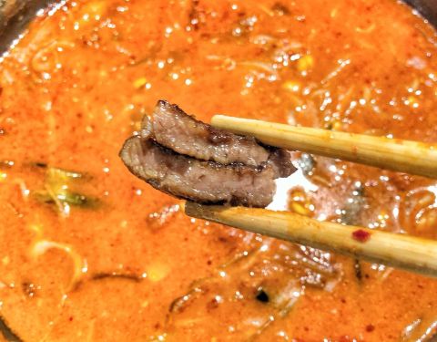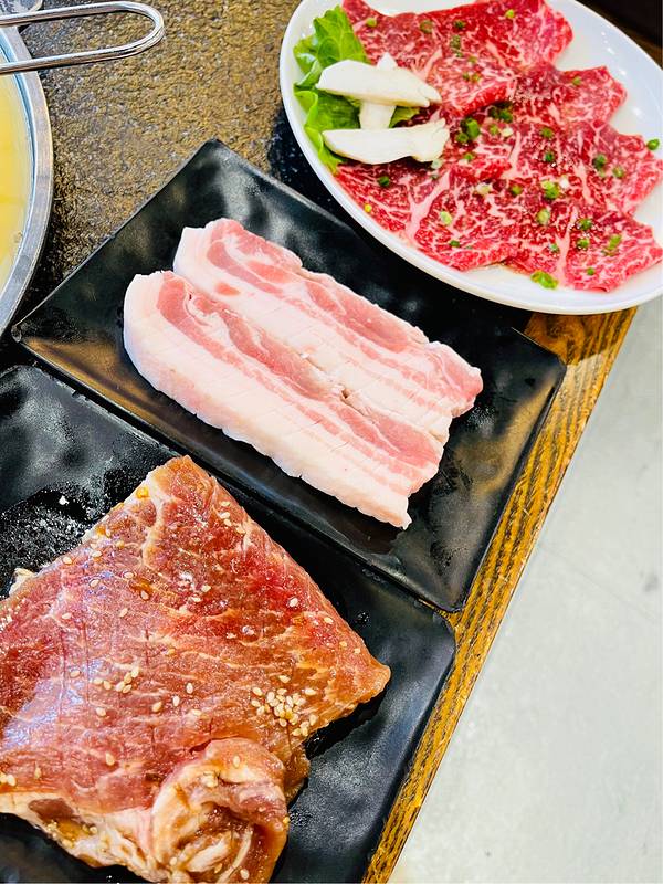 -薄切雪花牛肉、调味猪排、冷切厚五花,店员主动帮烤,一块块鲜美多汁。