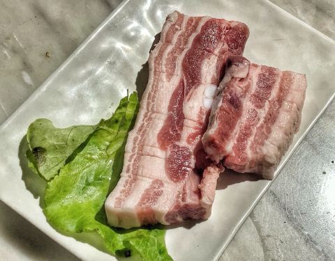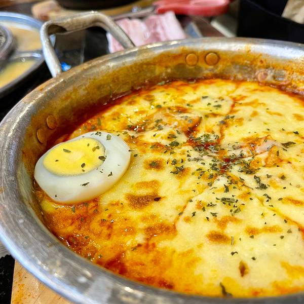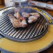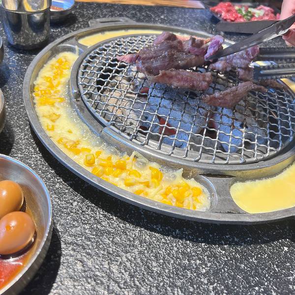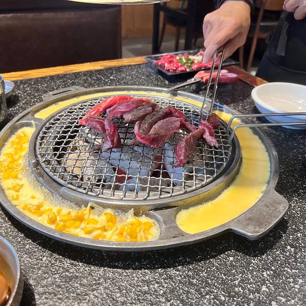 魔都第一家开在虹泉路 现在有4家门店了 饭点座无虚席 进店没有浓重的烤肉味 每桌都有服务铃 叫起来比较方便 餐前小食五碟 分别是蔬菜色拉、土豆泥、凉拌豆芽及酱萝卜 稀饭土豆泥的质感 可里面夹杂的豌豆差评 太硬了 全程自己烤肉 烤盘围边附赠鸡蛋羹和芝士玉米 吃完加料 需另收5元/份 「冷鲜五花肉」肉眼可见的肥>瘦 好在烤熟后表层坚脆 肉质紧 减少油腻感 还可以包生菜解腻 「猪排」调味太甜腻了 有点hold不住 「牛五花肉」肥瘦参半 汁水足 但吃口柴 不是细嫩的口感 「部队锅」泡菜口味的锅物 食材很丰富 有培根、红肠、香肠、鱼饼、鸡蛋、金针菇、大白菜和面条 口味大众 吃着管饱 口味方面不占优势 服务和环境可以再下功夫