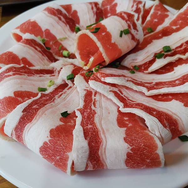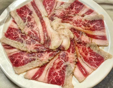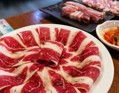 -薄切雪花牛肉、调味猪排、冷切厚五花,店员主动帮烤,一块块鲜...提前电话预定后准时抵达,直接被领到预留的座位,一路往里走,一路听到店员热情的招呼声。