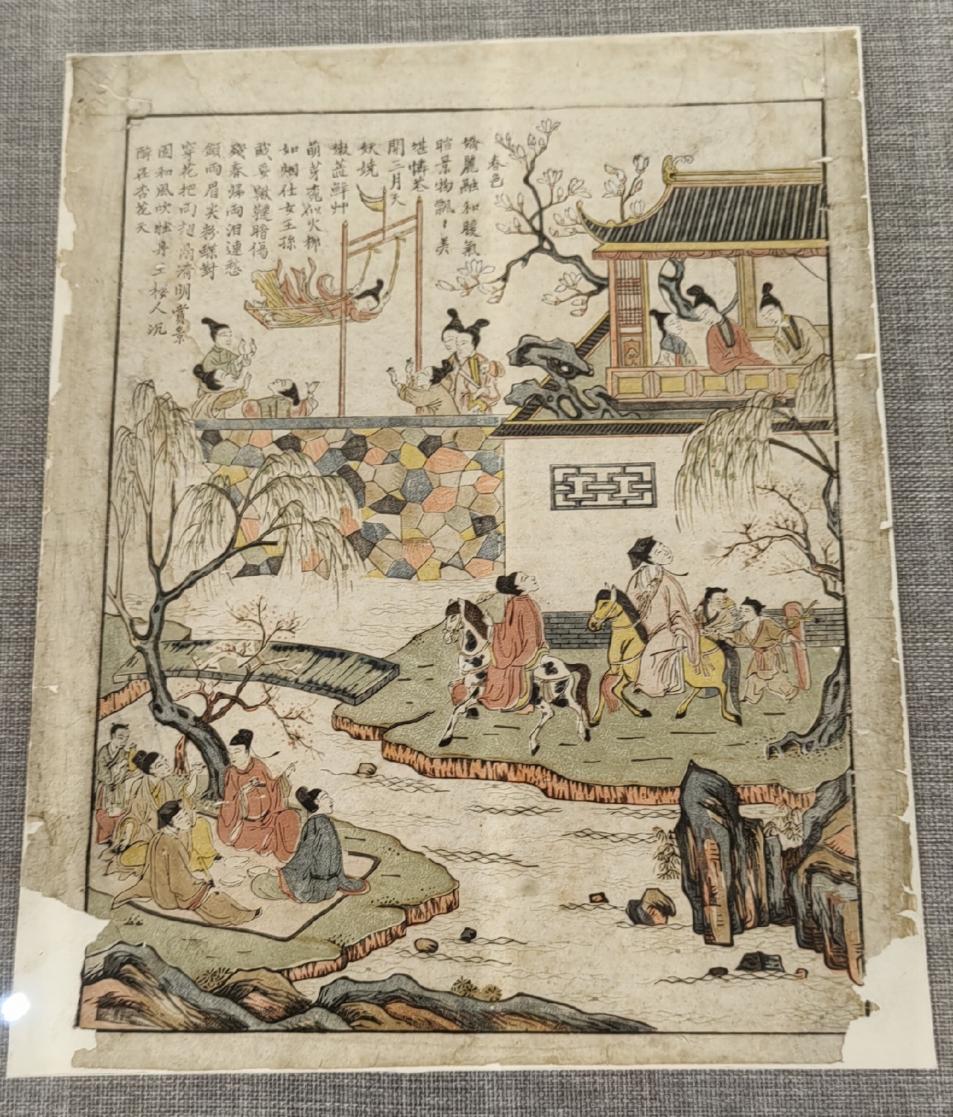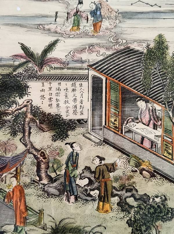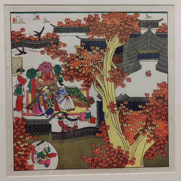 桃花坞木版年画,由绣像图演变而来,始于明,盛于清,风格雅致,构图饱满,形象鲜明。乾隆年间传入日本,对十七世纪日本“浮世绘”版画产生了深刻影响。 桃花坞木版年画是苏州的一张亮丽名片,它承载着江南文化的习俗,以门画、中堂、条屏为主要形式,题材多为祈福迎祥、驱凶避邪、时事风俗、戏曲故事等。 繁盛于明代的拱花、饾版印刷工艺绘写工致、气格高雅,与苏州文人画相结合后,诞生了康乾"苏州版"中"文人版"花鸟博古图。 西风版借鉴西方几何学透视法和明暗法,模仿铜版画施以排线,表现光影关系,色彩艳丽清透,题材以描绘城市生活和市民风俗为主。