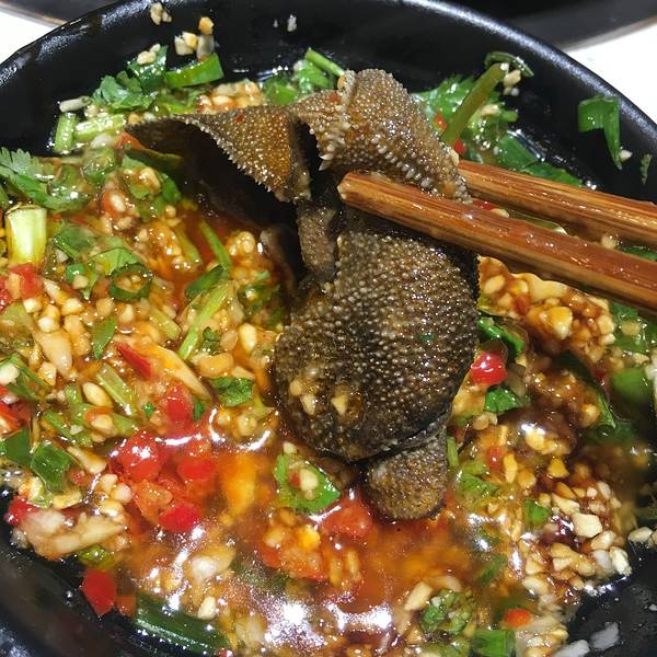 可能是饿的吧,第一顿饭吃上已经快下午两点了,以前不能吃辣的我,觉得辣的很好吃,吃的挺爽,但也就吃个七分饱,还想留着肚子吃别的呢。小胡同里的这家店人很少,就我们一桌,后来查发现可能不是正宗的吧。吃完饭回住处休息了一会儿,成都这时候的天气偏凉,但不是很凉,就穿卫衣薄外套挺舒适的。然后又出发觅食,买了红糖糍粑,挺好吃的。去了那个什么饭店,雨田饭店。