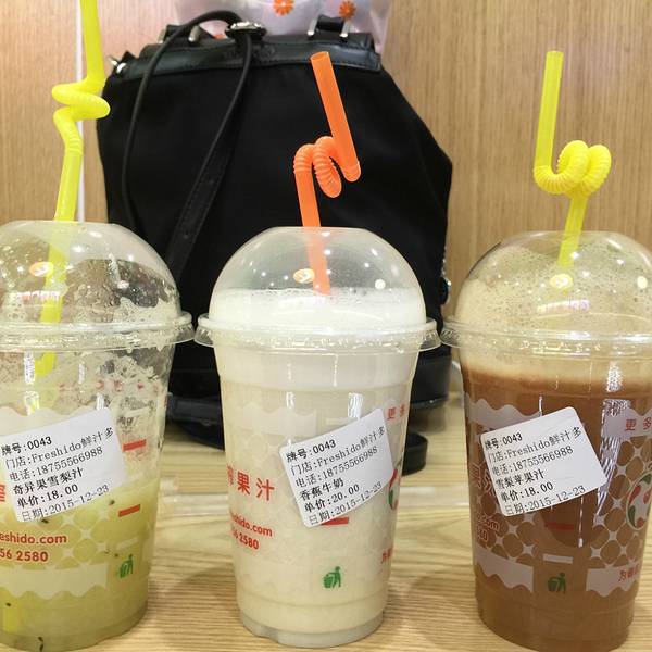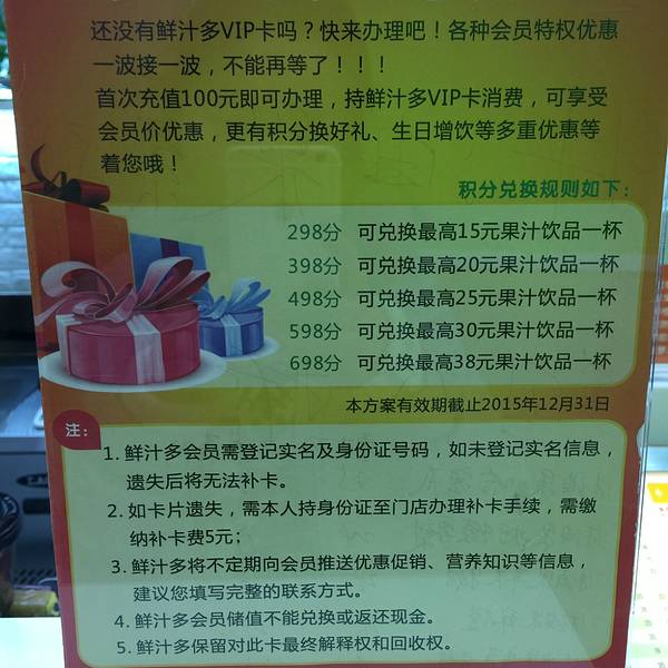 马鞍山金鹰天地2015年8月29日开业,开业至今人流量对多的地方就是美食,我也在一家家体验,负一楼江南小镇对面的鲜汁多便是这次体验对象。顺便说以下,作为马鞍山地标的金鹰天地,附近的公交车非常多:2路、14路、23路、109路、121路、202路,徽商银行站下即到。鲜汁多店的广告语是100%鲜榨果汁,店内的橱窗里、柜台上也都摆放了很多新鲜水果。店内的饮品种类非常多,主要有葡萄系列、玫瑰火龙果系列、牛油果系列、木瓜系列、芒果系列、奇异果系列和石榴系列,或者是纯果汁、或者是几种水果的混合果汁。当然,可能会因为季节的原因,譬如说这个季节的石榴系列就没有。鲜汁多的果汁因为是新鲜水果鲜榨的纯果汁,所以价格偏贵,我们三个人分别点了一杯奇异果雪梨汁18元、香蕉牛奶20元、香蕉苹果汁18元。香蕉牛奶味道很一般,喝了两口就放弃了,尝了朋友的雪梨苹果汁,非常好喝。鲜汁多店内环境还不错,可以坐下来边聊天边享用。因为圣诞节快到了,所以店家早早的就把圣诞树放出来了,三个妈妈带着三个娃,倒霉的熊孩子不小心把圣诞树弄倒了,树上的礼物掉了一地,好尴尬,但是美女服务员好有爱,让我们带好孩子就可以,自己一个人把它弄好。鲜汁多的所有饮料都有会员价,会员价和原价都有几元的差距,像火龙果汁原价38元,会员价只要33元,所以,办个会员卡还是蛮划算的。因为是常住居民,所以果断办了一张。