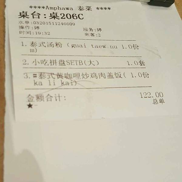 到江南西UME影院看戏,等候开场之前,朋友带我到附近的“安葩洼泰菜”吃晚饭。这让我想起之前去泰国的安帕瓦水上市场旅游。其实两个是一样的,只是译字不一样。这家餐馆在江南西人二楼,走过很容易错过。搭乘扶手电梯上来,左手边便是。店内大概有15张桌子。晚饭时间人也不算多,不用等位。店内装修简单,墙体以黑色为底色,木质的布置。天花板是很多简单灯泡的吊灯。 店里有免费wifi,速度还行。 水免费提供,但里面加了香兰叶,所以味道怪怪的。 菜品价格大概在30-40元。我们点了一个黄咖喱鸡肉盖饭,一个泰式汤粉和一个小吃拼盘,合计122元。个人口味不太喜欢。小吃拼盘中,烤鸡翅最好吃,外酥内软,其他的炸肉排只觉得油油腻腻,肉质也不新鲜。服务员加水也不是很及时,整体不是很满意,不推荐。