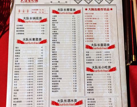 忆峥嵘岁月,品百味人生!大队长红色文化主题火锅在重庆也算很有年头并有排名的馆子!毫无疑问满满的红色文化主题,父母这一辈自然多了些许亲近!门店位于新华书店的斜对面,中天酒店2楼,相对很好找的位置,整个...忆峥嵘岁月,品百味人生!大队长红色文化主题火锅在重庆也算很有年头并有排名的馆子!毫无疑问满满的红色文化主题,父母这一辈自然多了些许亲近!门店位于新华书店的斜对面,中天酒店2楼,相对很好找的位置,整个装修风格很怀旧,代入感很强!火锅味道属于中上水平,菜品新鲜,嬢嬢些太多都算可以,基本算热情服务!话说,作为重庆土著,其实并没有把大队长纳入打卡地,只是老听见外地朋友推荐,所以抱着试试的想法前往,其实作为主题文化火锅,个人建议餐具和细节上应该更加有特色,增加部分互动环节和体验感的东西!如果欢迎词还是您好,欢迎光临之类的,会显得有点气氛不对,其实店家完全可以模仿剧本形式,无论环境,音乐,说话等等都用上主题色彩,将更完美!个人还是比较推荐,值得二刷!