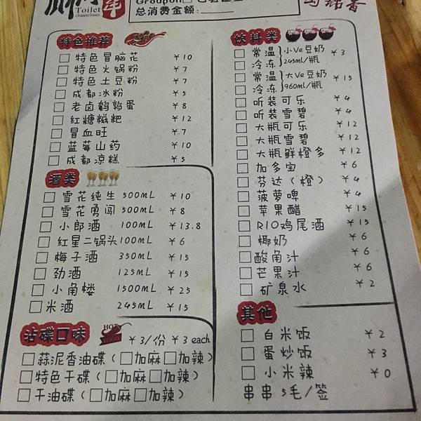到成都总归要撸串串的,搜到锦里附近这家厕所串串,这名字够可以不过好像还蛮红的,跟着导航过去要走点路的,基本已经蛮偏了,晚上小店生意也很好,外面也可以坐的,大成都果然都是喜欢撸串的。进去先选串串,一根签5毛,基本荤素都是5毛,有些串2根的也就1块,蛮实惠的,各种拿了点,不知不觉也拿了蛮多的,有点收不住手。个人推比较喜欢毛肚黄喉麻辣牛肉豆制品和菇类,东西还算新鲜,味道也还可以马马虎虎,其实我觉得可以不要油碟,这家串串也不是很辣,口味有点偏淡。然后就是成都到处都是的唯怡,下单的时候服务员没有提醒转发微信可以送一瓶唯怡,然后结账说只能送不能减免,好吧,那再喝一瓶。尝试了下成都凉糕,样子蛮可爱,QQ的蛮甜的,吃完辣的解解腻。