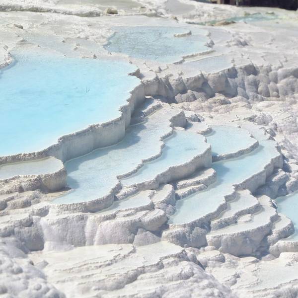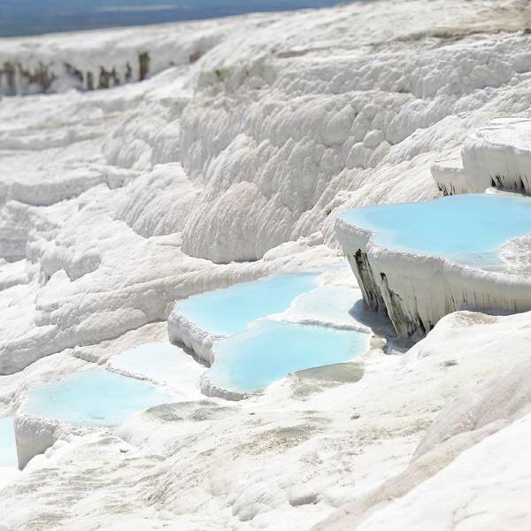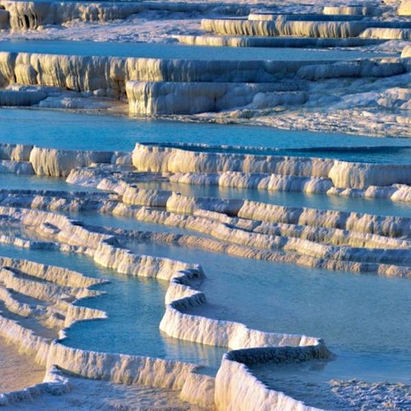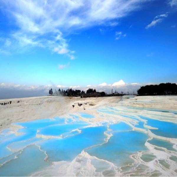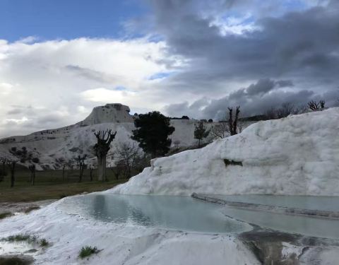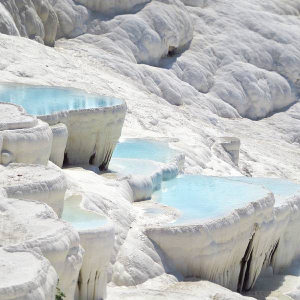 千年来,冷泉顺着山体不断流下,沉积下来的纯白,将山体塑造的如云朵一般,又用一池池冰蓝之水将其装饰打,扮,煞是好看,是土耳其旅游的必打卡之地~