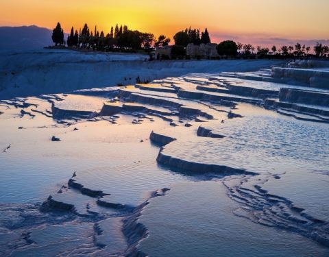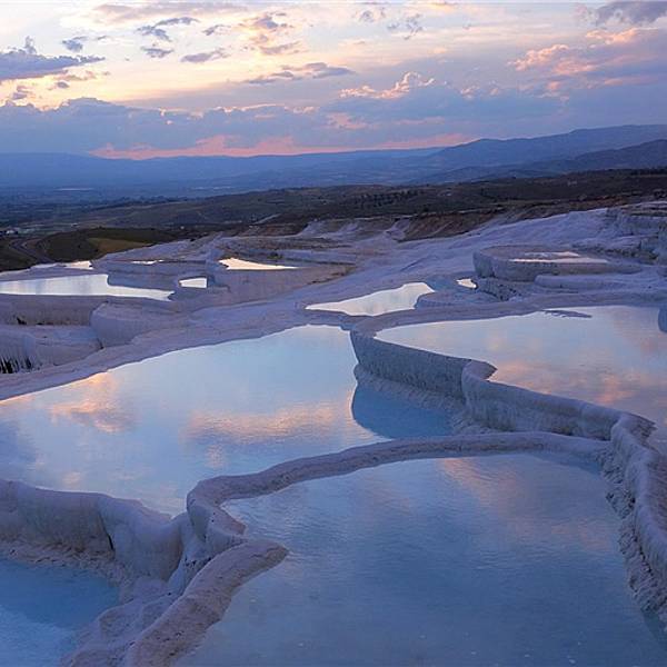 棉花堡(Pamukkale)位于土耳其代尼兹利(Denizli)以北19公里处。土耳其文中Pamuk表示棉花,Kale表示城堡,所以Pamukkale就叫做棉花堡。这里是远近闻名的温泉度假胜地,此地不仅有上千年的天然温泉,更有这种古怪的好似棉花一样的山丘,其实它们就是坚硬的石灰岩。1988年棉花堡和其顶上的希拉波利斯古城一起被列入世界文化遗产。独特的阶梯状“棉花”山丘棉花堡的景观十分独特,温泉自洞顶流下,将山坡冲刷成阶梯状,平台处泉水积蓄成一个个小池塘,从上往下看,一方方温泉平台像一面面镜子,映照着蓝天白云。从下往上看,像刚爆发完的火山,白色的岩浆覆盖了整个山坡,颇为壮观。独特的风景吸引了全世界很多摄影爱好者。埃及艳后泡过的温泉胜地有山有水的白色棉花堡,从希腊时代起就是温泉疗养胜地,传说埃及艳后也曾经在这里泡温泉。这里的水温终年保持在36至38摄氏度之间,水的酸碱值大概6左右。据科学鉴定,泉水富含钙、镁等矿物质,还可以直接饮用。来此泡温泉的游人络绎不绝,特别是一些欧美游客经常会全家一起来泡温泉。景区游览线路游客一般从景区北门进入,分别能看到城北墓地(超过1000座坟墓)、北大浴室(古城的核心建筑)和图密善拱门等遗迹。穿过集市能看到一座教堂和水神庙,在靠近南门的地方则竖立着太阳神庙遗址和圆形剧场。你可以先逛一下希拉波里斯古城,古城往南顺着山坡而下就是棉花堡了。傍晚可以欣赏日落美景棉花堡较为好看的区域就在从入口往上走的路上。一般从早上开始人会越来越多,然后接近晚上人会慢慢减少,所以如果下午到的话完全可以晚点过去,欣赏日落美景。白色的岩面会被阳光点染出淡淡的色彩,而岩面中的水波则记录下天空变幻的奇异色彩。
