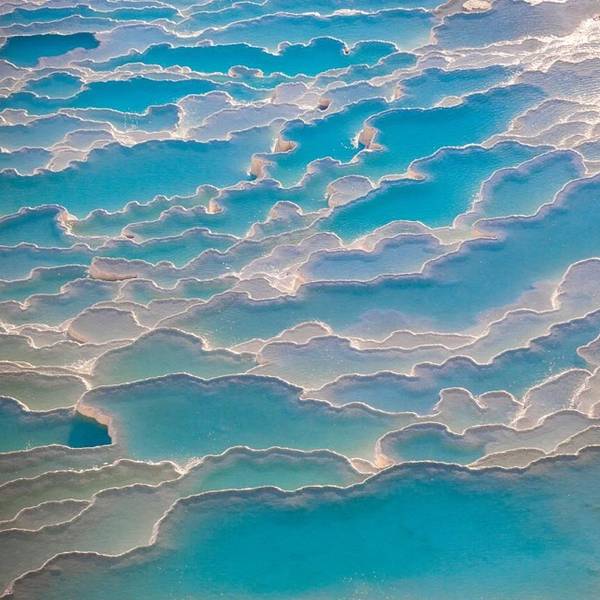 是钙化物质主要沉积的区域,如棉花如云朵,纯洁的白色,许多大自然打造的池子盛满了冰蓝冷泉,层层叠叠,蓝白交错,非常漂亮~