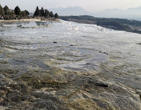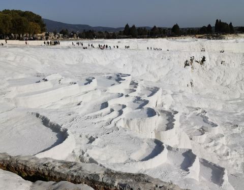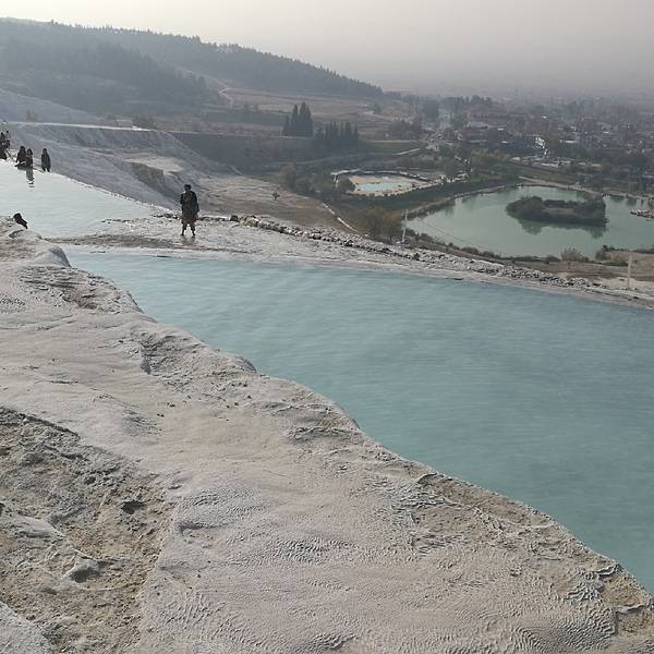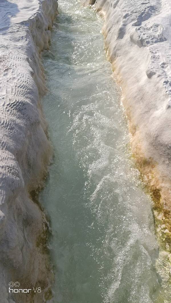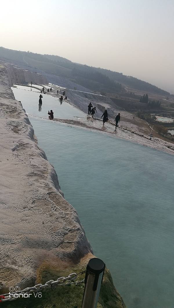 可能是因为季节不对,也可能是天气原因,要么就是角度没找好,棉花堡的实际样子还是比较让人失望的。墙是很白,水不蓝,偏浅绿,整体组合起来并没有那么强的视觉冲击。可能是因为期望太高,失望也比较大。这的保护措施还是不错的,不能穿鞋进到水池中。但是因为地质原因,光脚进入实在是扎脚了,我们可能只走了一半吧,一是时间不够,二是实在是太疼了。水从石缝中出来时是温热的,确实温泉,泡泡脚很舒服。实际在这游玩的就是拍照,一路狂拍,也跟同团小姐姐学了很多拍照知识。最后还要说一点,我们去时已经十一月了,还真有西方大姐穿三点式在这照相,真的是要风度就不能要温度。