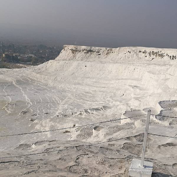 看到棉花堡还是挺兴奋的,因为真的很好看。导游介绍棉花堡名字由来,一是这里产棉花,产量据说还很多。二是其外形像铺满棉花的城堡。为什么是白色,就是泉水从山顶往下流,所经之处历经千百年钙化沉淀,形成层层相叠的半圆形白色天然石灰岩阶梯。水温终年保持在36到38摄氏度,泉水富含钙、镁等矿物质,对风湿、皮肤病、妇科病、消化不良及神经衰弱等有神奇疗效。但是超红的人气却给棉花堡带来灾难,川流不息的游客与山下大量兴建的温泉旅馆,使得泉水量锐减。枯竭的水源使原本棉白色的地表转黑,土耳其当局意识到事态严重,宣布暂时关闭棉花堡的观光,让此地得以休养生息。重新开放之后,除了限制游客在棉花堡的游览范围与活动(需赤脚、不准游泳),也约束温泉旅馆的开发。