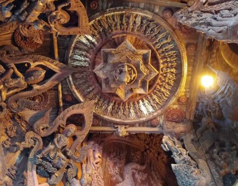 这是芭提雅最好的寺庙了,全柚木建筑,雕栏画栋,难以计数的人物雕塑栩栩如生,造型别致,每一尊雕像都值得细细品味,按照导游的解释,其中有一组雕塑代表多子多福,情侣可以坐在旁边以祈求子孙延绵,家族兴盛。...
