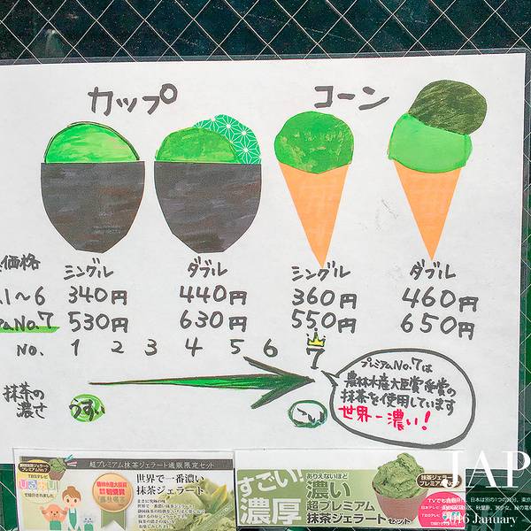 静冈和宇治一样,是日本有名的抹茶之乡,所以抹茶甜品也是一大特色。 这家抹茶冰淇淋店算是 静冈 的网红店了,在东京也有分店。 店内将抹茶按浓度分为七个等级,其中NO.7为最高浓度,据说会苦到怀疑人生╮(╯▽╰...