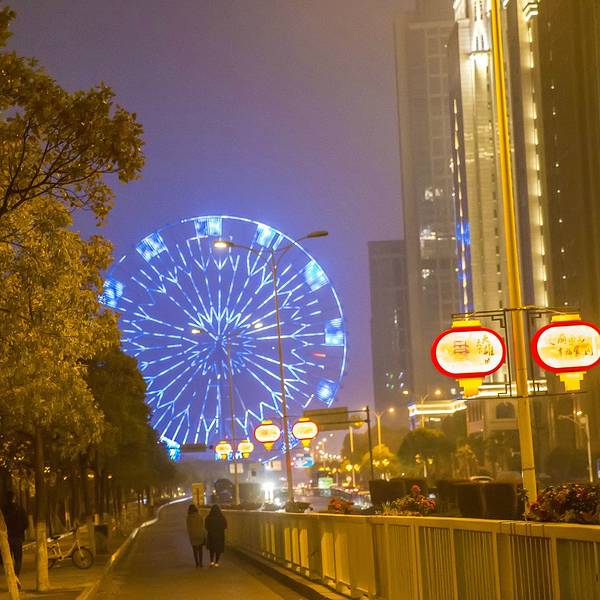 到达顶端的时候俯视南昌,美丽夜景尽收眼里。南昌新城发展还是很快的,这10来年红谷滩新区已经是高楼林立!在这里也能隔河与著名的滕王阁相望,只是感觉有点小了!据说摩天轮有个传说,也或许是宣传推广的噱头吧: 一起乘坐的恋人在摩天轮达到最高点时, 如果恋人亲吻, 就会永远一直恩爱下去,否则就可能分手!所以,没带恋人去的,就不要打望其他恋人吊箱了,否则会虐心的!当然了,带女友来的,这也是千载难逢的好机会,提前备好功课哟! 摩天轮转一圈是30分钟,15分钟就到达顶端,也就是浪漫上演的时间点。乘坐 摩天轮尽可能选在天气晴好,空气通透的时候,这样能清清楚楚欣赏到赣江两岸的景象。还有傍晚时分在上面欣赏晚霞也是很唯美的!这里除了摩天轮,还有滨江游乐园以及赣江水上乐园等可以一并游览;秋水广场喷泉更是不可错过的景点。实用贴士: