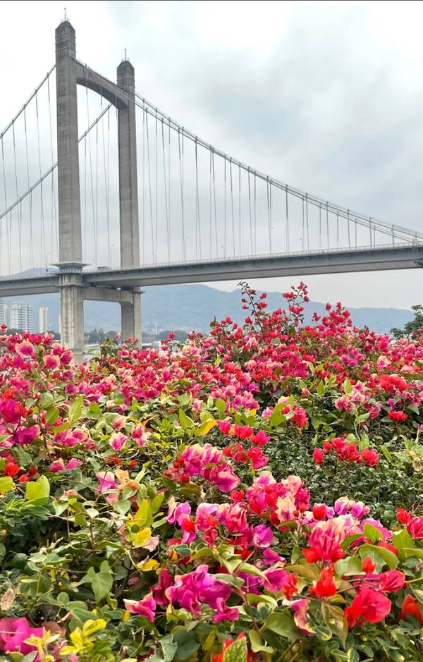 闽江一线江景与滨江生态相融,让赏花之旅更添开阔与悠然。公园依江而建,4.6公里滨水步道贯穿全园,一侧是缤纷花田与葱郁林木,一侧是波光粼粼的闽江,江面上货轮缓缓驶过,江鸥、白鹭时而翩跹掠过,江涛轻拍岸滩,风声与花香相融,满是自然野趣。鼓山大桥下的临江观景台视野无遮挡,可俯瞰花田全景,远眺鼓山叠翠、闽江东流,鼓山大桥的宏伟桥身与花海、江景构成层次丰富的画面,傍晚时分,落日熔金洒向江面,波光粼粼宛若碎金,是福州公认的滨江落日打卡地,浪漫氛围感拉满。