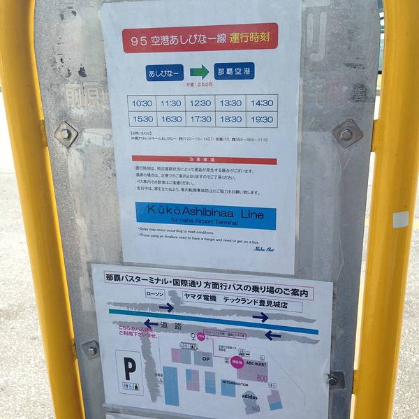 到达方式:可坐Yuri-Rail单轨电车至那霸机场站,再搭乘那霸机场至奥特莱斯的95路公交巴士。这部专线巴士停在那霸机场国内线到达出口的四号巴士站。从那霸机场出发的每小时整点发车(10:00-20:00),从奥特莱斯出发的每半小时发车(10:30-20:30)。直达,途中不停站。票价为大人250日元/人,儿童130日元/人。