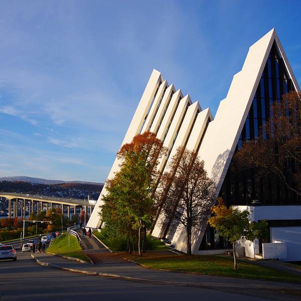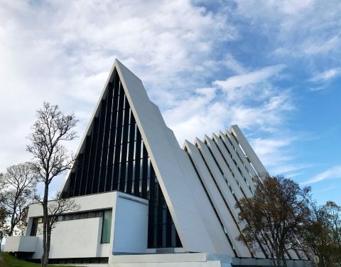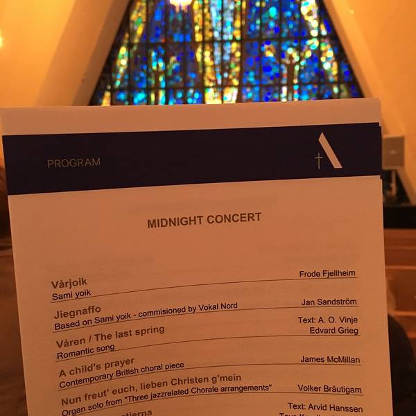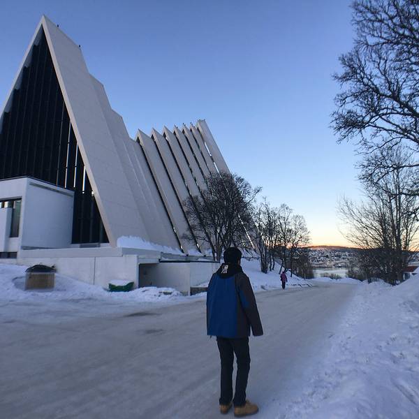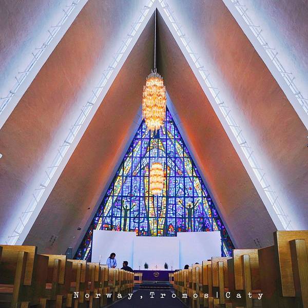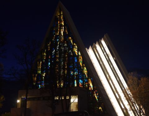 这是我们在北极圈里的第一站,位于北纬69度的海港城市特罗姆瑟。午夜的阳光正透过一面巨大的马赛克玻璃,暖洋洋的地洒在教堂的每一个角落,若不是身上有浅浅的倦意,真会不自觉地忘了时间。