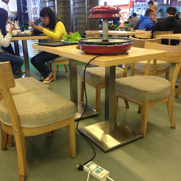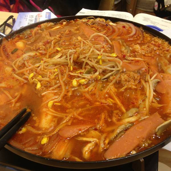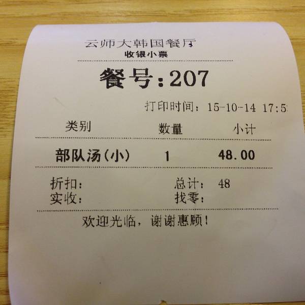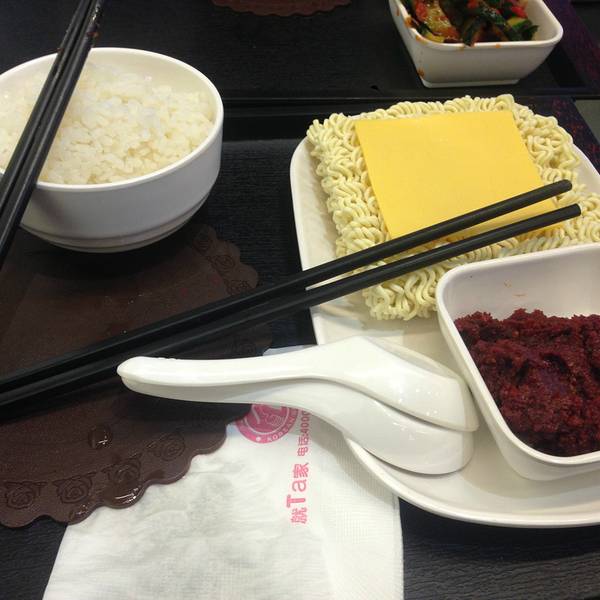 整洁的环境、整齐的布置是该餐厅的最大亮点。 该餐厅位于云南师范大学呈贡校区东区食堂三楼后门边上,是去年秋季开业的。餐厅的经营者是一群来自吉林延边的朝鲜族人,主营韩式风格餐饮,当时开业期间享受5-7折的折扣。 今年回校后陪女票专程来此品尝美食的。整个餐厅占据了东区食堂的后门区域,面积很大,而且环境非常好,餐厅的整个区域非常干净;桌椅的排布很整洁,整个大堂也显得明亮。大厅的内侧是厨房,分为三个独立区域,分别负责面食、餐食和清洁室,功能分区很好;餐厅右侧是点餐台和塑胶菜单,里面呈现了各式各样的餐点,形态非常逼真,另外还设置了咖啡机和饮料柜,里面放置的都是韩国的饮料。 在这里需要先点餐付钱后才能上餐,我们点了一份部队火锅后便找了位置坐下。座位很干净,座位上有一个火锅炉和烤炉,其中火锅炉是用燃料罐里的燃料驱动的,非常清洁;烤炉则是用的电烤,没有油烟味,感觉很好。餐厅中央有个屏幕,上面依次会写着订单号,轮到我们的时候会自动叫号,感觉很方便。大概等了十多分钟后上餐,餐具很整洁,另外还赠送小菜,不过火锅有点略小,感觉菜装的很勉强;另外刚端上的火锅里面的菜蔬都是生的,要自己煮一下才可以,里面的餐种还是蛮多的,有午餐肉、火腿肠、肉沫、韭菜、白菜、豆腐、年糕、洋葱、豆芽等,感觉肉的分量有点少,基本上都是午餐肉和火腿肠这些加了淀粉的肉类;另外绿色蔬菜的分量也偏少,至于其他则还不错。 熟了后仔细品尝一下,感觉味道还行,配上韩国的大酱味道还不错,午餐肉还算是好吃,火腿肠和肉沫就有点差强人意了;年糕很爽口,感觉还算好吃,另外白菜味道不错,可惜分量太少了;其他的味道一般。 总体感觉这里的餐饮还是不错的,而且价格也不贵,可以过来品尝一下。