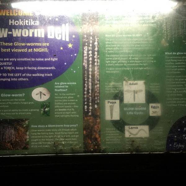 Hokitika这个萤火虫洞很小,免费的。没人管理,所以拍照打灯光也可以。但萤火虫非常怕光怕声音,所以希望大家去看的时候还是自我管理一下。我们去的时候有中国父母还特意拿着手机直照萤火虫,给孩子看虫子长什么样子。。。
