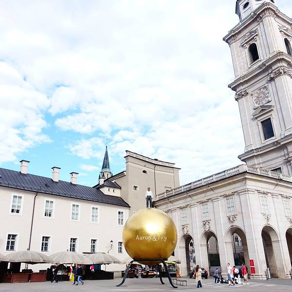 穿过一个门洞,就来到了Kapitelplatz,广场上有一个醒目的大金球,上头还站着个假人,不远处就是萨尔茨堡大教堂(Salzburger Dom