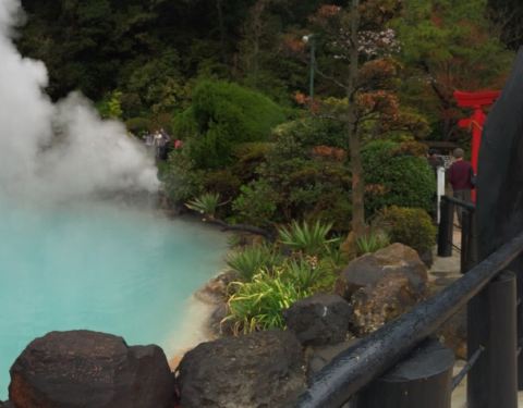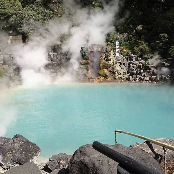 交通指南:...从别府坐车去期待已久的“别府地狱”。在车上便能看到这边四处“冒烟”,真像来到了地狱一样。首先去参观别府地狱中最大的海地狱,温泉的颜色是蓝绿色的,温泉水里富含硫酸铁成分,使得温泉呈蓝绿色。