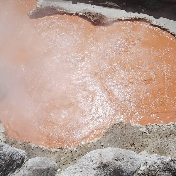 呈现红色的原因是在地下的高温与高压之下,富含了氧化铁与氧化镁的红热泥发生了自然的化学反应,从地层喷出后堆积在池子里,把温泉池子染上了一片红色!