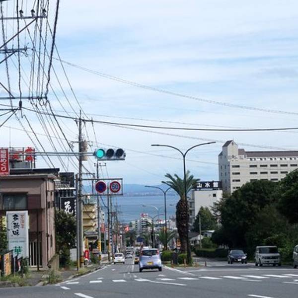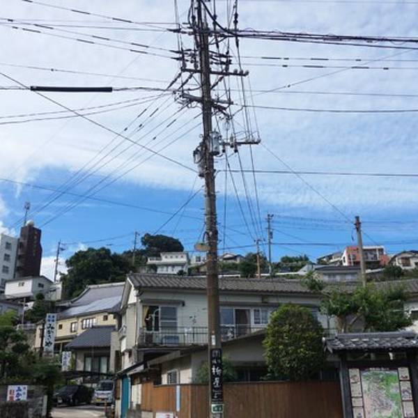 这样的决定,是导致我们后续爬了一个多小时山路的“罪魁祸首”,也是遇见宁静美好唯一的路。事实上,铁轮往下走似乎是个风味小镇,街道普遍木质结构,是不是所谓的江户时代风格?我不是太了解..但沿途有老式酒店,也有别致的洋式住宅,还有特别老底子的戏院,家家户户门口都有温泉管道,也没有当地人在路上行走更没有游客,特别静谧。这样的气氛和 周围环境十分调和,说不出的美。走过风味小镇,你会发觉真正步入日本农村了!而且是个建在山上的沿海农村,爬上陡峭山坡有点吃力..加上那个只刮妖风的台风,第一次觉得幸好体重重,不然直接吹走了!