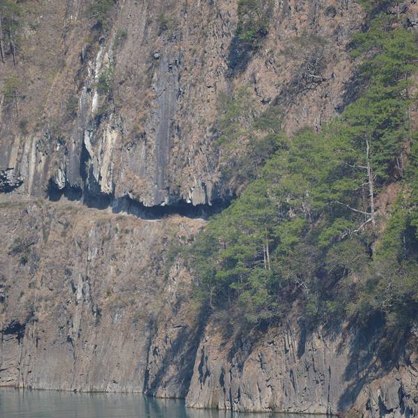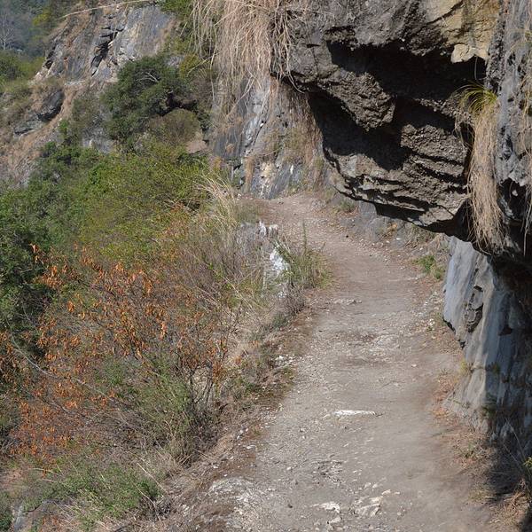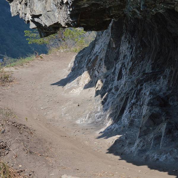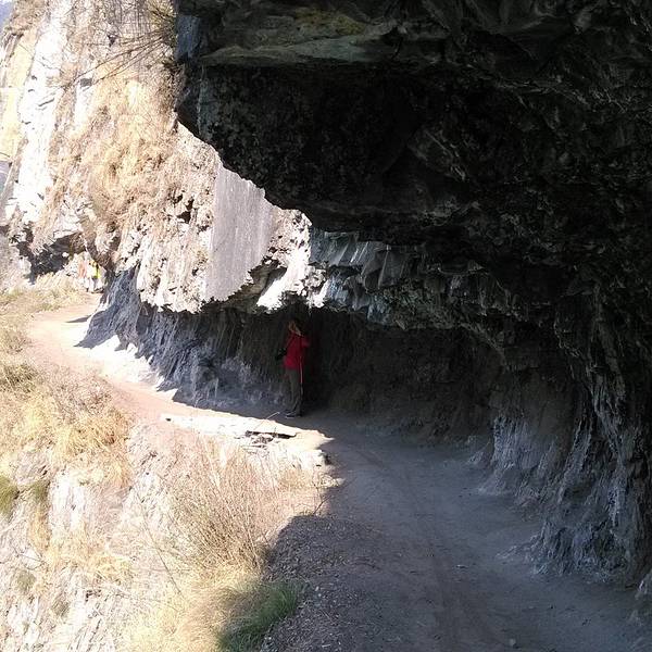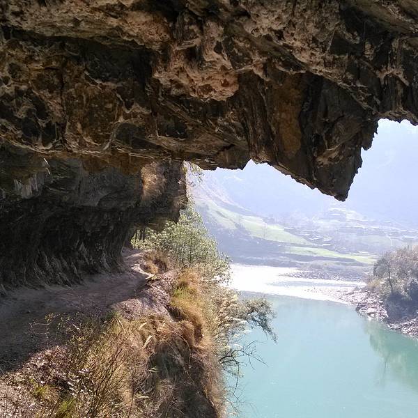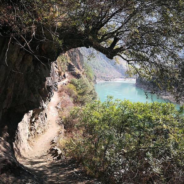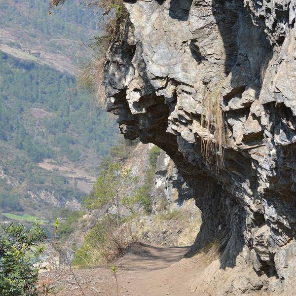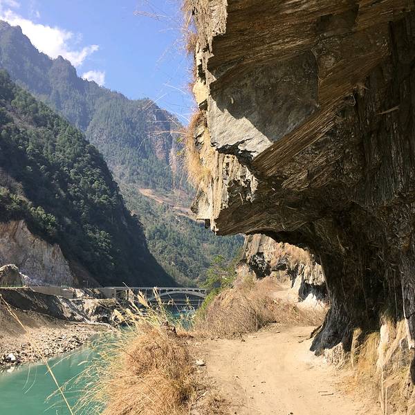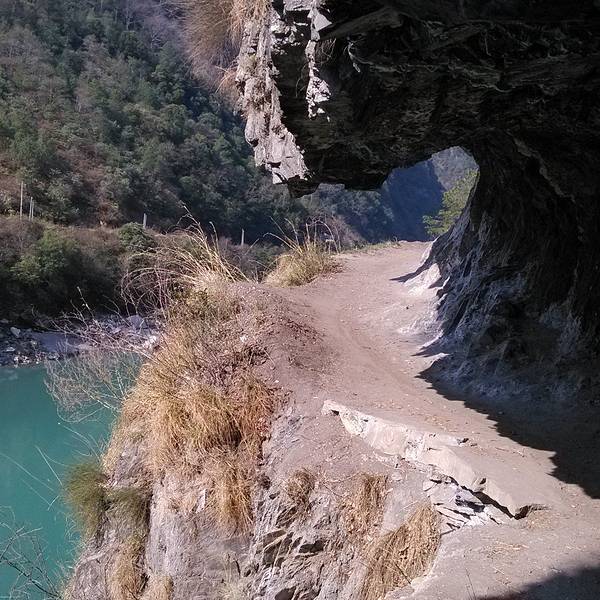 雾里村到朝红桥约两公里的路段,是茶马古道的一部分。这条古道,完全是刀劈斧凿,生生地从近乎90度垂直的悬崖壁上开出一条仅可容两人交会的小径,人行其中,如踯躅于巨大的岩石隙缝,下临悬崖,滔滔怒江,奔腾不绝,令人生畏。