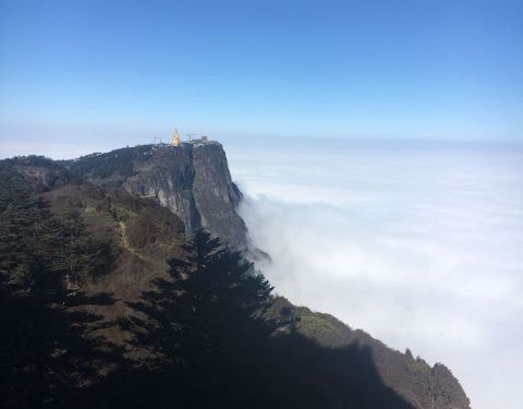 峨眉山的最高处,独立在山崖顶上,周围是郁郁葱葱的原始森林。