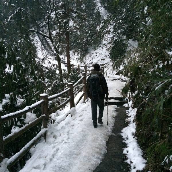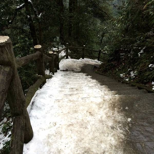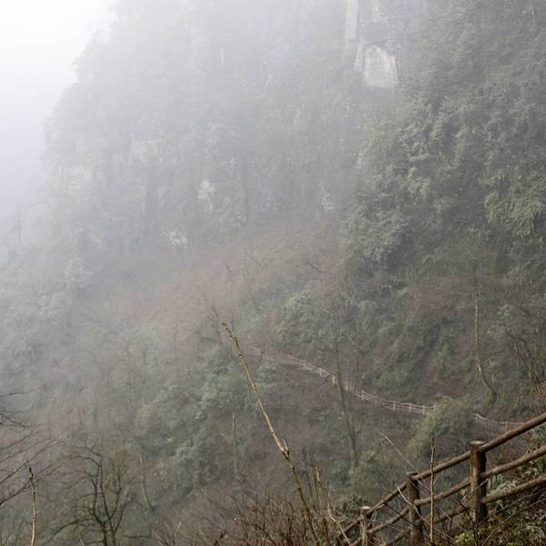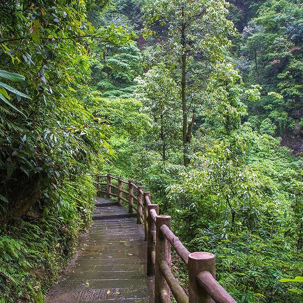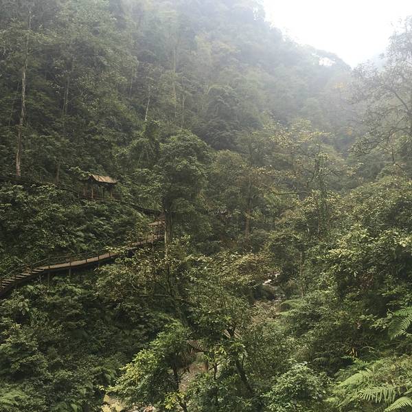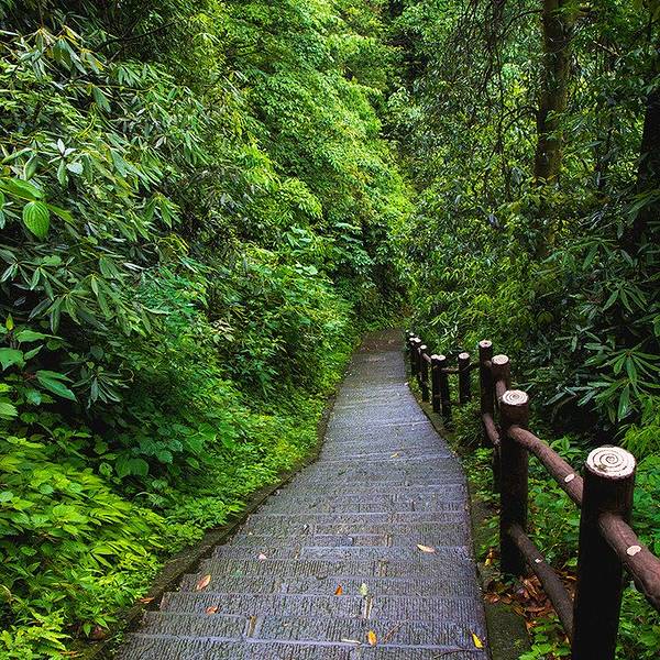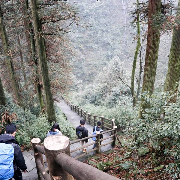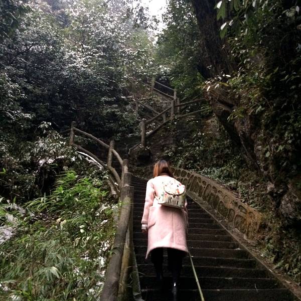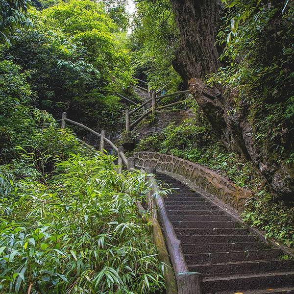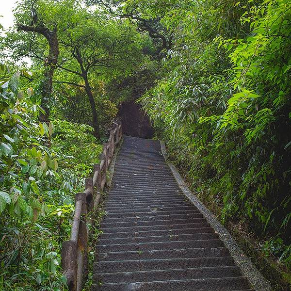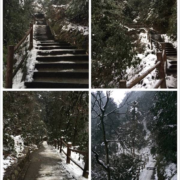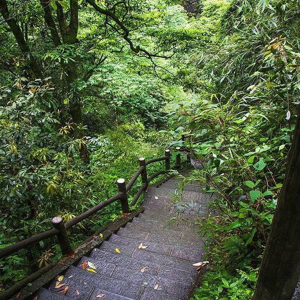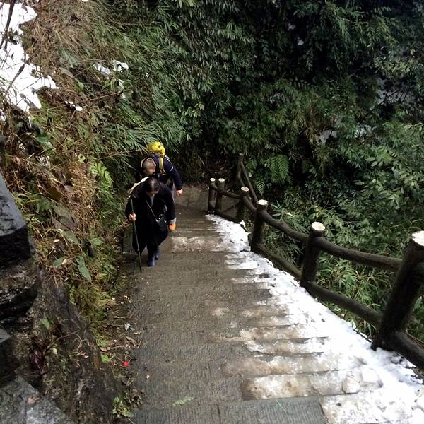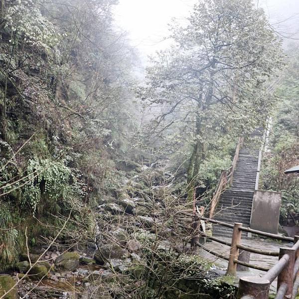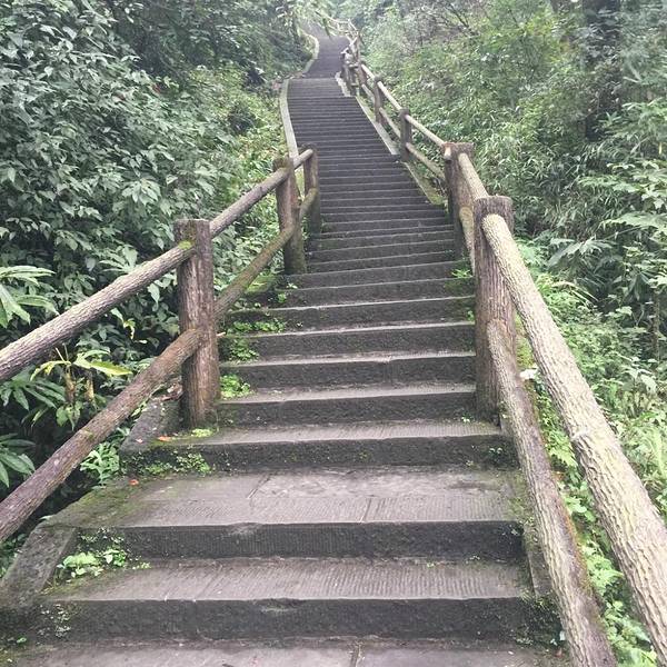 沿途景色美丽爆表!山中栈道。拍的不好,但确实很美。然而我们无暇顾及。看到这样的路就头疼不说了,2/3上山路,1/3下山路。原来峨眉山并不是一直爬山到顶,而是翻越一座又一座的山。沿途景色美丽爆表!然而我们无暇顾及。累的同时想的最多的就是在天黑前能爬多远就爬多远。