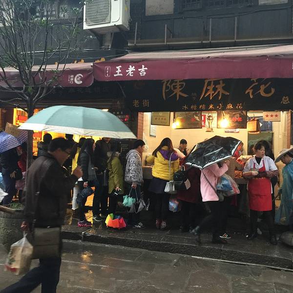 小面——开启滋味丰富的一天 吃了昨天洪崖洞的亏,我俩第二天早上早早的起床,飞速洗漱完毕就赶紧奔向景区。 到磁器口的时候差不多是8点,万幸,果然来度假的人普遍都没这么勤奋,景区的人虽然也不少,但还不至于像昨天那么夸张。 美好的一天,当然要从一顿丰盛的早餐开始。 说到 重庆 早餐,最著名的肯定是小面了!即使在我们 东北 十八线小城里,没有海底捞、肯德基,但是一家 重庆 小面还是必须的有。我们的目标锁定在“秦云老太婆摊摊面”,据说是 重庆 最有名的小面,在 重庆 有多家分店,磁器口这家店就在加油站旁边,蛮好找。店面不大,因为来得早,庆幸还有最后两个位置,我估计十一黄金周9点钟起床的小伙伴要排长队才能吃到。我们点的是招牌的小面、抄手,还要了一份凉粉(一共40元)。 小面非常非常的好吃!不仅面条劲道顺滑,更重要的是汤汁用料很足,麻辣浓郁,吃完以后唇齿留香,这一碗小面是被我俩抢着吃完的!当然抄手也不逊色,我觉得他们家的核心在于这个麻、辣、佐料的程度控制的真是恰到好处。