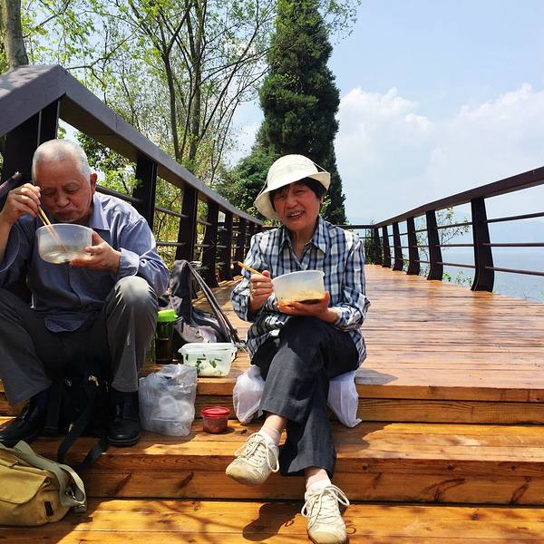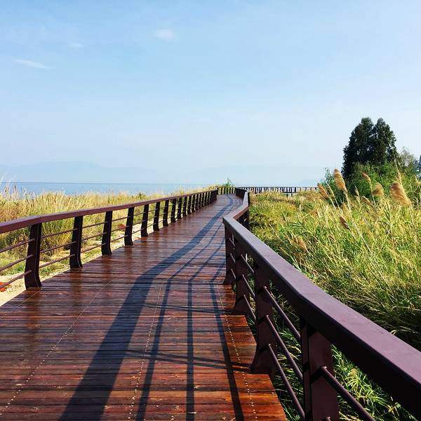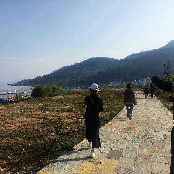 第四天一早, 我们在农家乐吃了简单的早餐之后, 就出发上路, 今天依然是一个好天气。早上的日出。早上收网回来的渔民, 在收获渔网上挂满的银鱼。途中还能遇到冬季在抚仙湖, 进行高原训练的外地自行车队。这附近有一个帆船基地, 在抚仙湖玩帆船也是一个不错的体验。这是海口镇附近的时光栈道。海口镇附近的湖景时光栈道。这里的湖水很清澈, 远处的悬崖是一处风景极好的地方, 这个地方当地名字叫“狗刨磕”。悬崖下方有一个天然形成的石洞, 偶尔会有人在石洞躲避风雨休息。途中偶遇一处黄锁莓树丛, 疲劳的我们享用这大自然的馈赠!以前小时候吃过的熟悉的味道, 多年之后再次品尝。湖边的野花居然也开的这么美。这是樱花谷附近某处延伸湖中的巨石。走累了, 坐在时光栈道底下躲躲太阳休息一下。远处就是希尔顿酒店。一处漂亮的海湾。途中遇到一对坐在路边的老夫妇, 他们也是在时光栈道徒步, 他们坐在路上吃自己带的凉米线, 我想我们老了就该如他们一样, 一起去看最美的风景, 吃着自己亲手做的最简单的食物, 这样到老, 也是一件幸福的事情。湖边的时光栈道两旁在种植绿化植物, 劳动的人们中午就在湖边的树荫下午睡。走累了, 路上摘几颗这种未完全成熟的红色的马桑, 那酸爽, 让你立刻打起精神!走了那么远, 最终我们终于回到了新河口, 此时已快到日落时分。 伴着夕阳, 我们结束了几天的旅程, 也用我们的双脚, 以最慢的速度, 欣赏到了抚仙湖最美的风景。 接下来让我们一起欣赏一下, 我们此行的起点也是终点的, 新河口湖滨公园的日落。夕阳中的一片野花。抚仙湖水陆客运站的夕阳。水路客运站位于抚仙湖海岸线最平缓最热闹离澄江县城最近的北岸,也是抚仙湖水上最大的遗迹,它作为保护抚仙湖而渐渐衰落的具有中国特色建筑的码头,不应该为保护抚仙湖随着多年前取缔邮轮游艇等机动船而被大家所遗忘。虽然现在几乎已经荒废,但个人觉得这也是抚仙湖的一道美景,冬春季,海鸥都扎堆在这里与人共舞,与岸边石板栈道两旁的花海交相辉映……这是抚仙湖最好喂海鸥的位置。一路走来,我们变得更加勇敢了, 前路充满未知, 而这更促使我们努力向前!