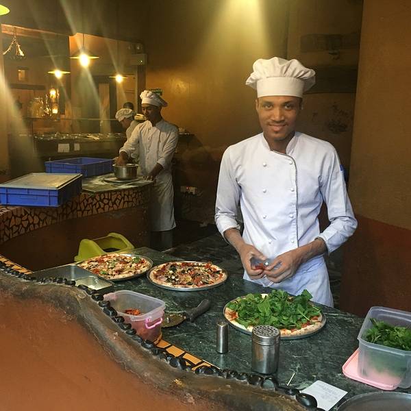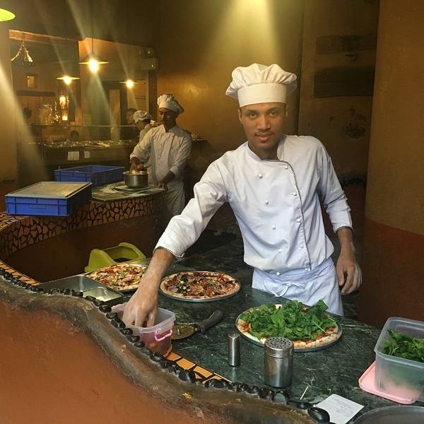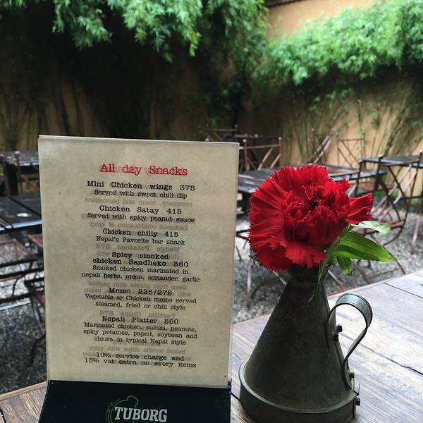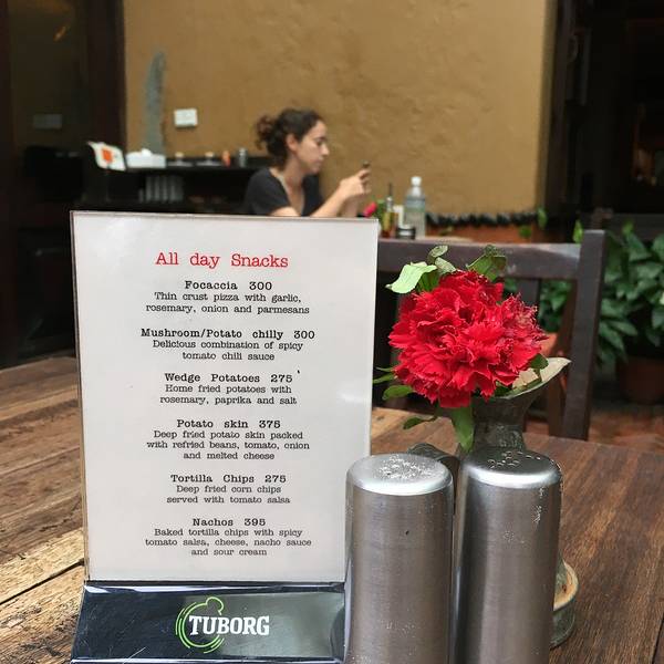 坐落在尼泊尔的商业区Thamel,主要做的是西餐,逛街逛累了来这里。这里没有公交车或者是其他的公共交通,一般就只能靠步行或者是坐当地的三轮车tuktuk过来了。因为是现做的,等的时间略微有点长,饭店里有wifi,如果是一人行没有同伴聊天消磨时间,等不住的话可以问服务生密码,网速还蛮快的。 披萨和卷饼都很不错,建议点素的披萨,个人觉得要更好吃一些。非常推荐冰的卡布奇诺,很好喝。其他的意大利面之类的东西也都很正宗,同行的一个朋友是葡萄牙人,也说正宗而且好吃。而且量很大,如果是3个正常饭量的女孩子的话,点两份都已经足够了。菜单上的菜虽然很多事尼泊尔语的发音,但是边上都有英文的解释,略懂英文的朋友对照一下看也能大概知道什么菜是什么东西做的,手机里离线一本英文词典也是很有必要的。餐厅的装潢很棒,帘子用长短不一的擀面杖替代。有硬座和软座的选择。同样很棒的设计还有盐罐和胡椒粉罐,在其他餐厅一般很容易混淆,都要事先倒一点出来辨认,但是这里的盐罐上的小孔是S(salt),胡椒粉罐上的小孔是P(pepper),一目了然。厕所在餐厅的左侧,门口也是挺漂亮的,找了一圈都没发现那里是厕所,最后还是要问服务生。厕所在外面,蹲式和坐式的马桶都有,还算比较干净吧。服务生态度都很好,英语日常的沟通都没有问题。尼泊尔的英语口音可能不太好听得懂,大家可以跟服务生直说叫他放慢语速,多听几遍基本上都没有问题。 消费相对较高,换成人民币在国内都算是中等偏贵了,更不用说这里是尼泊尔。而且菜单上的价格还要乘以百分之十几的税费和服务费,到最后账单上的价格要更高一些的时候大家不要惊讶,不过呢,这种情况下就不用在付小费了。人均消费大约80人民币左右。不过还是建议大家来这里吃,正宗的西餐可能还是加德满都这里的最便宜了。