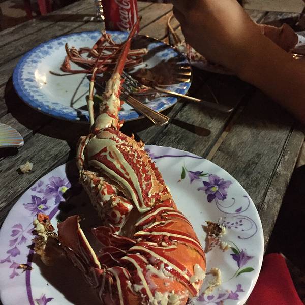 下午乘坐提前三天预订的新咖啡大巴前往美奈。上车前,把入住酒店告诉新咖啡工作人员,大巴司机按照顺序依次把乘客送到各自酒店门口。 入住backpackers resort,放下箱子直奔海鲜烧烤大排档,豆豆毫不犹豫地点了朝思暮想的大龙虾!
