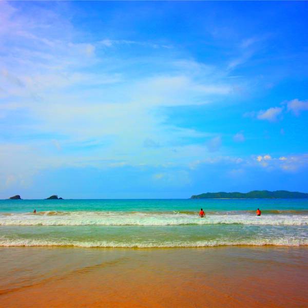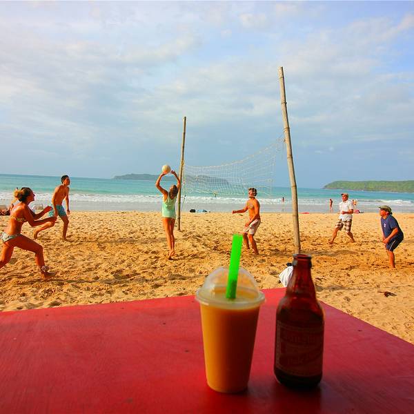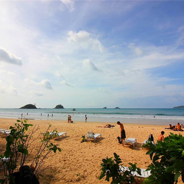 开始兜兜沙滩美景了,可以租借躺椅也可以在茅草屋品尝美食。海滩边的小山和岛屿上风景秀丽