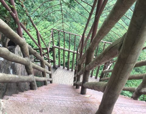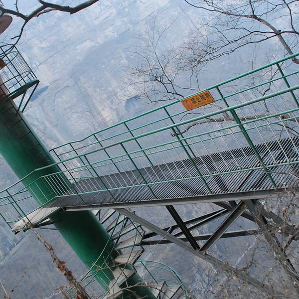 这个“之”字形旋梯我走过两次,第一次赶上十一黄金周,游客很多,头顶着屁股往上走,人多闹闹嚷嚷地倒也没觉得太害怕,只是有点担心承重的问题。第二次清明节来的时候,几乎没有游客,那是我走在上面,脚下是镂空的铁梯子,悬崖下的山涧透过铁梯子露出来,腿是有点抖啊。