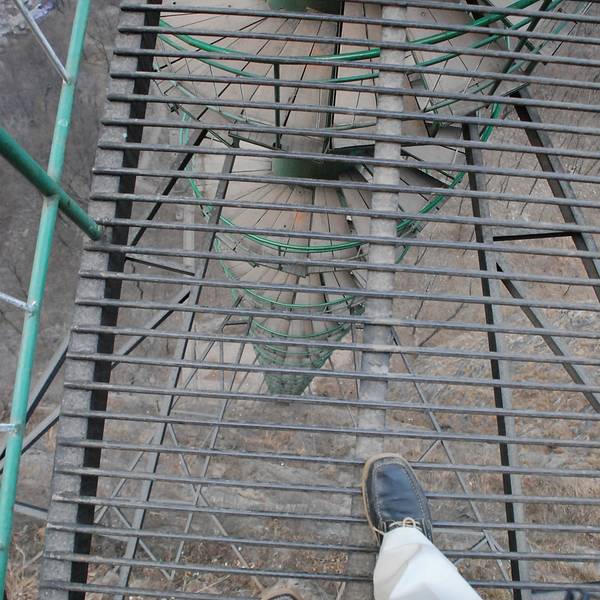 刚开始爬的时候,因为海拔低,不觉得,爬到四分之一时,还跟下面挥手吹牛。再往上爬,腿肚子就有点软,心想,千万别往下看,就往上看。往上看也不行,因为这个旋梯太陡直,仰头看的时候,不由自主总有一种,旋梯从悬崖边倒离的感觉,怎么揉眼睛都不行。最后没招了,只好闭着眼睛,手扶着转体的栏杆,“盲上”!反正下面的朋友也看不见我闭着眼呢。